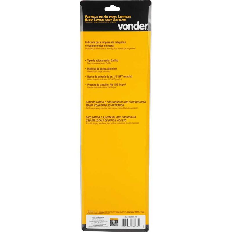 Pistola de Ar para Limpeza com Bico Longo Ajustável – Vonder PL3358 Mantenha seus equipamentos e máquinas sempre limpos e funcionando com a Pistola de Ar para Limpeza Vonder PL3358. Projetada para oferecer conforto e eficiência, esta pistola de ar possui um gatilho longo e ergonômico, reduzindo a fadiga durante o uso prolongado. Seu bico longo, fabricado em aço inox com conexões em latão, é ajustável de 33 a 58 centímetros, permitindo alcançar áreas de difícil acesso com facilidade. Ideal para oficinas, indústrias e uso doméstico, esta ferramenta garante uma limpeza precisa e eficaz. Com rosca de entrada de ar de 1/4' NPT e pressão de trabalho de até 150 lbf/pol², a PL3358 é compatível com a maioria dos compressores de ar. Invista em qualidade e praticidade para seus trabalhos de manutenção e limpeza. Especificações Tipo de acionamento: Gatilho Material do corpo: Poliacetal Rosca de entrada de ar: 1/4' NPT (macho) Pressão de trabalho: Até 150 lbf/pol² Massa aproximada: 0,250 kg Itens Inclusos 1 Pistola de Ar para Limpeza Vonder PL3358 Perguntas Frequentes (FAQ) Pergunta: Qual o material do bico da pistola?Resposta: O bico da pistola é fabricado em aço inox, garantindo durabilidade e resistência à corrosão. Pergunta: A pistola é compatível com qual tipo de compressor?Resposta: A pistola é compatível com a maioria dos compressores de ar que possuem conexão de 1/4' NPT. Pergunta: Qual a garantia do produto?Resposta: Garantia legal: 90 dias.