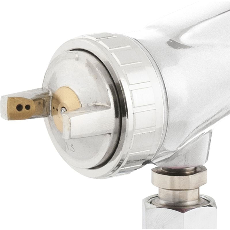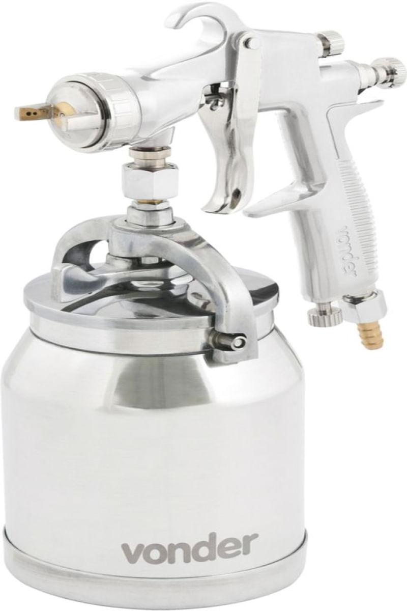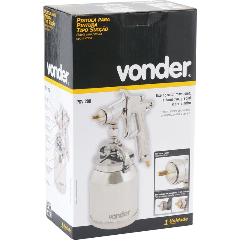 Conteúdo da embalagem1 Pistola para pintura Aplicações e dicas de usoNa configuração original de fábrica, acompanha bico e agulha de 1,5 mm, sendo indicada principalmente no ramo moveleiro em aplicações de seladores, vernizes, pesticidas e fundos, e em ambientes prediais, nas pinturas com tinta óleo, verniz para madeira, esmalte sintético e selador. Pode ainda ser utilizada, com restrições, no ramo de preparação automotiva, em aplicações de bases, primer, fundos, pinturas epóxi, PU e seladores, e em acabamentos automotivos, nas aplicações de vernizes, tintas metálicas, tintas PU, tintas comerciais e esmaltes. Também pode ser utilizada no ramo serralheiro, em aplicações de zarcão, esmaltes sintéticos, tintas automotivas, fundos diversos, tintas óleo e tinta martelada. O modelo permite a troca de agulha e bico pela medida de 1,3 mm (vendidos separadamente), aumentando a gama de trabalhos para acabamentos automotivos, nas aplicações de vernizes, tintas metálicas, tintas PU, tintas comerciais e esmaltes, ramo moveleiro, em aplicações de seladores, vernizes, pesticidas e fundos.Destaques e diferenciaisPossui bico e agulha em aço inox e capa de ar em latão, proporcionando maior durabilidade DETALHES TÉCNICOS Consumo de ar da pistola: 3,0 a 3,9 PCM (pé³/min) Pressão de trabalho da pistola: 29 lbf/pol² a 50 lbf/pol² Vazão de tinta: 140 ml/min a 190 ml/min Tipo da caneca para pistola de pintura: Tipo sucção Diâmetro do bico da pistola: 1,5 mm Material do corpo da pistola: Alumínio Material da caneca para pistola de pintura: Alumínio Material do bico da pistola: Inox Material da agulha da pistola: Inox Material da capa de ar da pistola: Latão Capacidade da caneca para pistola de pintura: 1 Litro Rosca de entrada de ar da pistola: 1/4" NPT (macho) Prazo de garantia: 6 meses