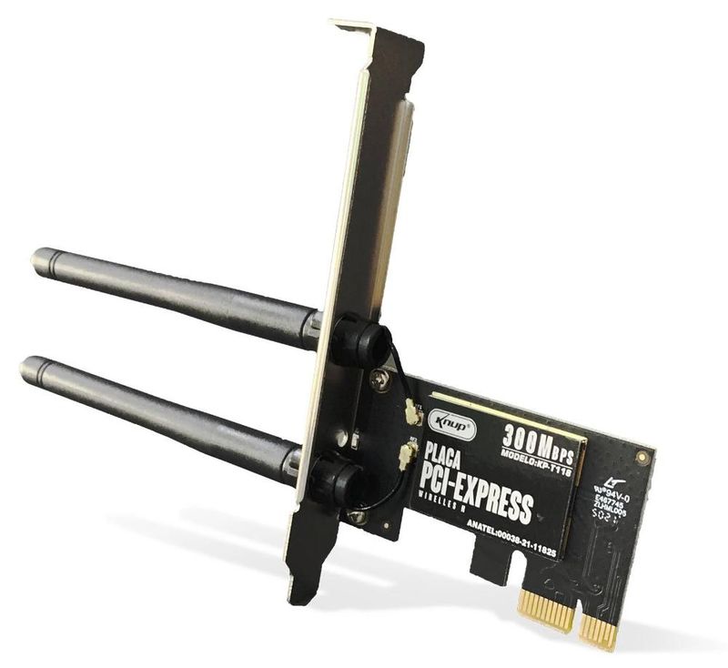 Placa de Rede PCI-Express Wireless 300 Mbps Knup KP-T118A melhor solução para conectar o computador a uma rede sem fio mantendo a qualidade e velocidade da conexão.Principais características:- Velocidade Wi-Fi de até 300 Mbps- Melhor Cobertura para maior alcance do Sinal- Duas Antenas para Ampla Cobertura- MIMO 2x2: Conexões simultâneas e estáveis- Tecnologia de roaming garante conexões eficientes e confiáveis- Fácil instalação, conecte ao slot PCI-E e a rede estra disponível- Compatível com Windows 10 / 8.1 / 8 / 7, Linux Kernel 3.11 - 4.3.15- Segurança: Criptografias WPA / WPA2Especificações:- Wireless Padrão: IEEE 802.11 b/g/n- Frequência: 2.4 - 2.4835Ghz- Taxa de sinal: 300Mbps a 2,4Ghz- Modo Wireless: Modo Ad-Hoc / Infraestrutura- Segurança Wireless: WEP, WPA/WPA2, WPA-PSK/WPA2-PSK- Tecnologia de Modulação: DBPSK, DQPSK, CCK, OFDM, 16-QAM, 64-QAM- Certificação: FCC, CE, RoHS- Interface: PCI Express- Antena: 2 Antenas- Dimensões da placa: 65,3 x 40,3 mmMarca / Modelo- Marca: Knup- Modelo: KP-T118Conteúdo:- 01 Placa PCI Express 300Mbps- 02 Antenas- 01 CD de instalação- 01 Manual de instalação