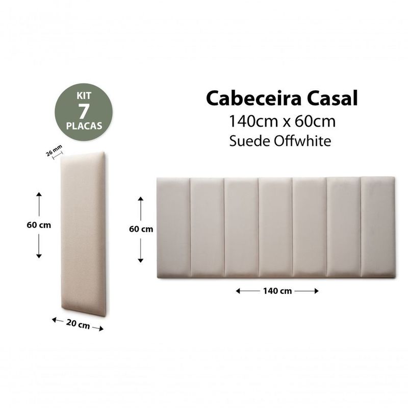 Placas Cabeceira Modulada Adesiva Casal Estofada 140cm X 60cm Kit 7 Placas - Suede Off White"Placas Cabeceira Modulada Adesiva Casal Estofada 140cm x 60cm Kit 7 Placas - Suede Off WhiteAs cabeceiras estofadas para cama box Flamingo Design trazem conforto e sofisticação para o seu quarto, tornando o ambiente mais aconchegante! As placas moduladas são uma ótima opção de decoração para você que quer praticidade na hora da instalação. Não é necessário furar a parede, as placas possuem fitas adesivas para fixação e você mesmo pode instalar facilmente!Nossos móveis são fabricados com materiais de alta qualidade e durabilidade, de fácil instalação e limpeza.A Flamingo Design te dá uma garantia de 3 meses contra qualquer defeito de fabricação!Confira abaixo mais detalhes sobre o produto:- Marca: Flamingo Design.- Modelo: Placa Modulada Adesiva.- Tamanho: Casal.- Qtd Peças: 7.- Comprimento Total: 140cm.- Altura: 60cm.- Largura (espessura): 26mm.- Material: MDF e espuma.- Fixação: Na parede com fita adesiva que já acompanha o produto.- Garantia: 3 meses.- Tecido: Suede.- Cor: Off White.Quantas placas você precisa para montar sua cabeceira?- Solteiro: 5 placas (100cm de largura).- Casal: 7 placas (140cm de largura).- Queen: 8 placas (160cm de largura).- King: 10 placas (200cm de largura).Como é feita a instalação?- Aplicar sobre a parede limpa (utilize um pano seco para remover qualquer poeira).- Faça as marcações na parede para auxiliar na instalação usando um nível ou fita métrica.- Observe as tramas do tecido para que todas as placas fiquem na mesma direção (veja a marcação atrás da cabeceira indicando o sentido).- Retire a proteção das fitas adesivas da placa.- Cole diretamente na parede uma placa de cada vez, pressionando por alguns segundos para garantir a colagem.Cuidados adicionais:- Instale as placas somente em paredes lisas. Não garantimos uma boa fixação em paredes com textura ou grafiato.- Pode ser colado em parede lisa, MDF, drywall, papel de parede liso (sem textura).- Para remover as placas utilize uma espátula e puxe com cuidado para descolar o adesivo (se desejar utilize um secador de cabelo para amolecer o adesivo).- As fotos são reais do produto. Podem ocorrer pequenas diferenças de cor devido ao tratamento de imagem e calibragem de cores do seu monitor ou celular."