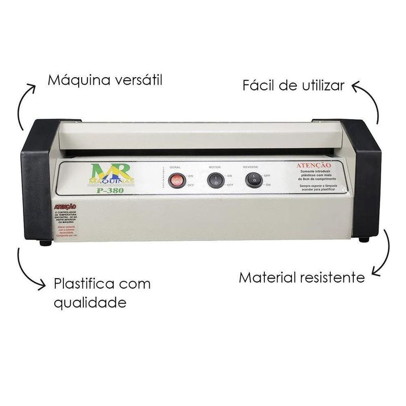 Plastificadora E Poliseladora Profissional P380 Até A3 110vPlastificadora e Poliseladora Profissional P380 até A3 110VChegou a solução perfeita para proteger e dar um toque profissional aos seus documentos, crachás e muito mais. Você poderá plastificar velocidade qualquer tamanho do crachá ao A3 (A3, ofício, meio ofício, A4, crachá, CPF, título de eleitor, CNH, RG, CGC e CNPJ). Dotada de 4 cilindros de preensão reguláveis, feitos de borracha, garantindo uma camada brilhante e transparente que realça as cores, protege contra rasgos e respingos de líquidos, proporcionando um aspecto profissional e durável. O processo de plastificação é rápido e eficiente, economizando seu tempo e permitindo que você produza mais em menos tempo.Medidas:Comprimento: 45cm.Largura: 24cm.Peso: 6,600Kg.Altura: 16cm.Especificações:Potência: Em aquecimento: 460w / Aquecida: 60w.Termostato auto ajustável de alta pressão.Extensão de Plastificação: 35cm.Voltagem: 110V.Possui reversão.Modelo: P380.Itens Inclusos:01 Plastificadora e Poliseladora Profissional P380 até A3 110V.Código: P380e110MRProdutoLojaPlast.