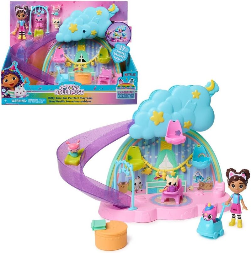 - Entre de cabeça no único e magico mundo da Casa de bonecas da Gabby, se divirta com o novo e incrível playset da Kitty Care, rica em detalhes e totalmente personalizadas. - O playset vem com 15+ peças para você se divertir, essas peças incluem 1 figura, 3 animais para ajudar na brincadeira e outros diversos acessórios para você usar. - SE SINTA DENTRO DO MUNDO DA GABBY: O playset vem com detalhes igual a serie, para que você se sinta dentro do mundo magico da boneca mais fofa do mundo! - DESENVOLVA A CRIATIVIDADE: Desenvolva a criatividade e a imaginação com o playset da Gabby! - Esses brinquedos estimulam brincadeiras e a criação de histórias divertidas. Ideal para crianças que amam aventuras! Conteúdo da embalagem: 1 playset com acessórios - Dimensões do produto 34 x 13 x 34 cm - As cores podem variar entre as imagens e o produto. - Imagens meramente ilustrativas. - Não recomendável para menores de 3 anos por conter peças pequenas que podem ser engolidas.