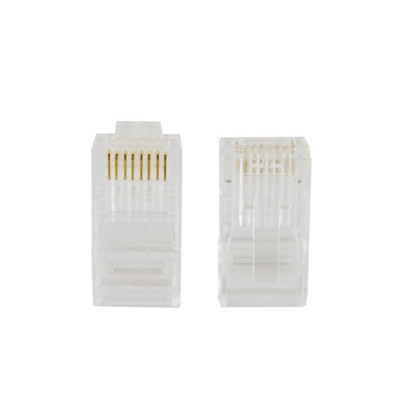 Plugue Rj-45 Evus Cat5e Utp 8x8 Transparente Pacote Com 100Informações do ProdutoCaracterísticas O conector RJ-45 EVUS é ideal para cabeamento de redes de alta qualidade e performanceESPECIFICAÇÕES TÉCNICAS DIMENSÕES - Produzido em Termoplástico não propagante a chama UL 94V-0 - 8 vias em bronze fosforoso com 50µin (1,27µm) de ouro e 100µin (2,54µm) de níquel - Respeita as normas CAT5e