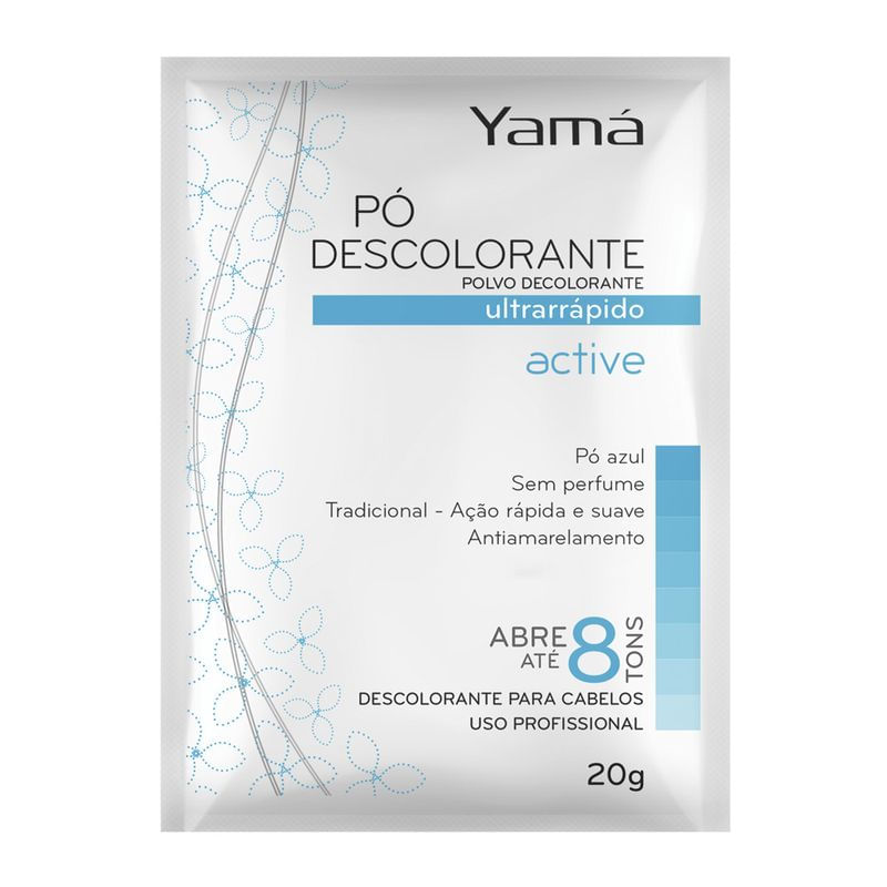 O Pó descolorante Yamá Active Tradicional, é indicado para todos os tipos de cabelos. Possui ação rápida, coloração azul, não possui nenhum tipo de odor e abre até 8 tons. Teste de Mecha: Separe uma mecha fina no alto da cabeça e prenda o restante do cabelo, para que não entrem em contato com a área do teste. Aplique o produto na mecha separada com o auxilio de um pente ou um pincel de plástico mantendo uma distância mínima de 1 centímetro da raiz. Deixe o produto agir de acordo com a tabela de tempo de ação. Caso ocorram danos, fragilização ou quebra dos fios, suspenda o uso imediatamente. Teste de Alergia: Retirar os brincos, aplicar atrás da orelha com auxilio de um cotonete o suficiente do produto, para cobrir uma área de 1 cm. Esperar 30 minutos sem lavar nem cobrir ou tocar o local. Se no decorrer deste período você constatar reações anormais tais como coceira, vermelhidão ou inchaço na zona testada ou em volta dela, suspenda o uso imediatamente. Modo de usar: Após os testes de Toque e Alergia, não lave os cabelos previamente. Dissolva o produto em um recipiente plástico com a água oxigenada, mais adequada na proporção de 1:2 (50g ou 6 colheres-medida de pó, utilizar 100ml de água oxigenada. Para 20g, utilize 40ml). Misture até ficar um creme homogêneo. Aplique nas zonas a descolorir e aguarde o tempo de pausa (verificado no teste de mecha). Enxágue com água e utilize um Shampoo para a retirada completa dos resíduos.