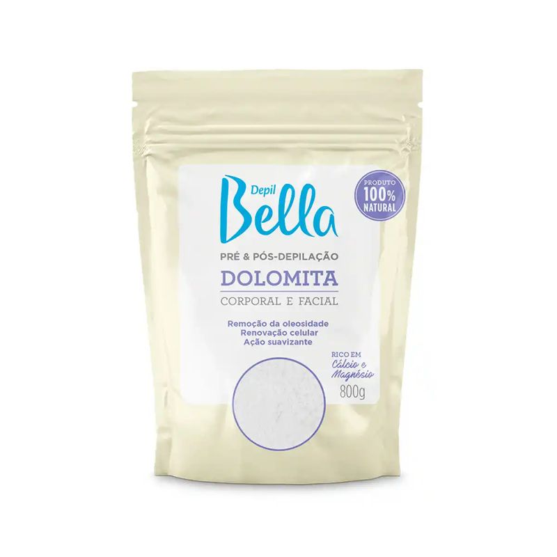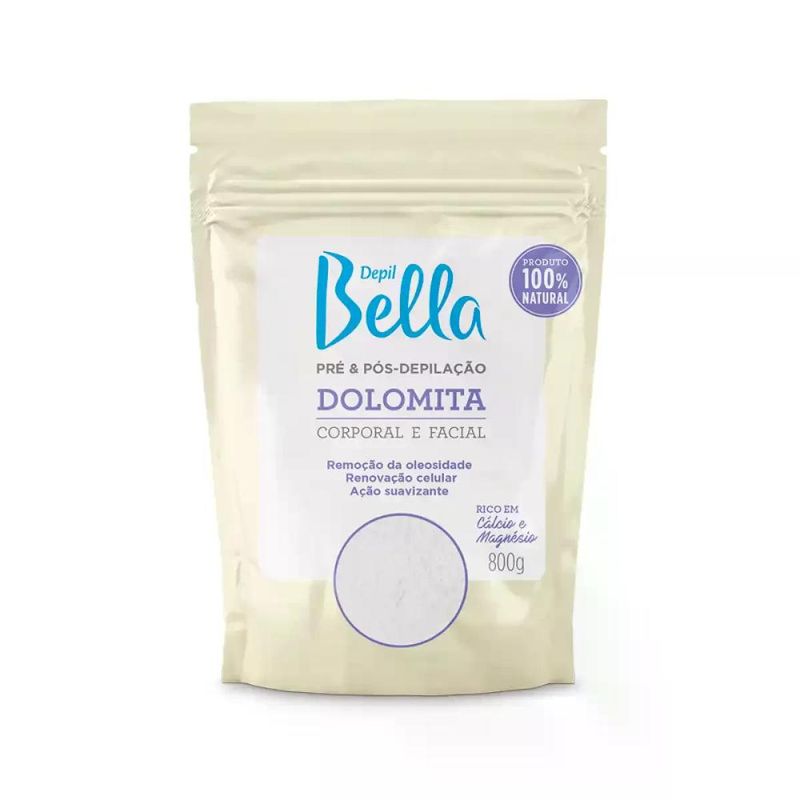 Dolomita depilbella corporal e facial 800g - DEPIL BELLA A Dolomita Depil Bella® é um pó fino rico em cálcio orgânico e magnésio, desenvolvido para preparar e proteger a pele para o procedimento de depilação. Desobstrui os poros, removendo a oleosidade e sudorese deixando a pele sequinha para que haja um processo de depilação mais confortável e eficaz. Substitui o uso de talco no processo de pré-depilação. No pós-depilatório, ajuda a tonificar e revitalizar a pele. Utilize a Dolomita também em tratamentos faciais, corporais e capilares. - Remoção da oleosidade - Renovação celular - Ação suavizante - Rico em cálcio e magnésio - Produto 100% natural - Dermatologicamente testado - Não testado em animais Modo de Usar: Pré-depilação: higienize a pele com a Loção Adstringente Depil Bella® e seque bem. Aplique uma camada fina de Dolomita na pele e espalhe com as mãos. Proceda ao procedimento de depilação na sequência. Pós-depilação: adicione água mineral ao pó e mexa até que se forme uma pasta homogênea. Aplique na região com auxílio de uma espátula descartável e deixe agir por 20 minutos. Remova suavemente com auxílio de gaze umedecida em água e seque a pele. Precações: Uso externo. Proteger o produto de locais úmidos e quentes. Manter fora do alcance de crianças e conservar em recipientes fechados.