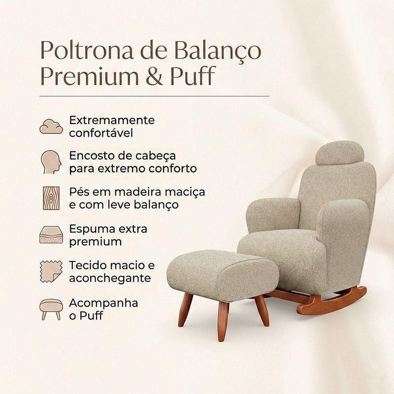 Poltrona Amamentação De Balanço Com Puff Aurora Conforto Extra E Design Atual Chenille Bege FendiA Poltrona de Amamentação com Balanço Aurora foi pensada para quem busca conforto elevado, design orgânico e uma experiência de uso que transforma o ambiente. Seu formato envolvente valoriza a decoração e proporciona uma sensação de acolhimento desde o primeiro contato, tornando o momento de relaxar muito mais agradável e funcional no dia a dia.Com balanço suave e estrutura firme, a Aurora entrega uma experiência de descanso equilibrada e silenciosa. O puff que acompanha o conjunto amplia o nível de conforto, permitindo apoio total das pernas, enquanto o revestimento em tecido chenile premium oferece toque macio e visual sofisticado, ideal para compor ambientes elegantes e aconchegantes.PRINCIPAIS BENEFÍCIOS? Conforto elevado para uso prolongado? Design orgânico que valoriza o ambiente? Balanço suave e silencioso? Puff incluso para apoio das pernas? Toque macio e acabamento premium? Estrutura firme e estávelCARACTERÍSTICAS TÉCNICASModelo: Poltrona de Balanço Aurora com PuffCategoria: Poltrona Premium/Poltrona de BalançoFormato: OrgânicoCor: Bege FendiEstrutura interna: Madeira de alta resistência secaBase de balanço: Madeira maciça reforçadaEstrutura do puff: Madeira maciça reforçadaEspuma: D28 PremiumRevestimento: Tecido Chenile PremiumEncosto de cabeça: IntegradoAssento: Amplo e ergonômicoPuff: InclusoMEDIDAS DA POLTRONAAltura: 100 cmLargura: 78 cmProfundidade: 94 cmAltura do assento: 54 cmMEDIDAS DO PUFFAltura: 43 cmLargura: 43 cmProfundidade: 43 cmCUIDADOS E CONSERVAÇÃOPara manter o produto sempre bonito, recomenda-se a limpeza com pano levemente umedecido, sem uso de produtos abrasivos.ATENÇÃOAS IMAGENS SÃO MERAMENTE ILUSTRATIVAS E PODEM SOFRER VARIAÇÕES DE COR E PEQUENOS DETALHES DE ACORDO COM O SEU MONITOR, ILUMINAÇÃO DO AMBIENTE E ATÉ MESMO A SUA PERCEPÇÃO VISUAL.Garantia: 3 meses contra defeito de fabricaçãoPoltrona Amamentação de Balanço com Puff Aurora Conforto Extra e Design Atual Chenille Bege Fendi