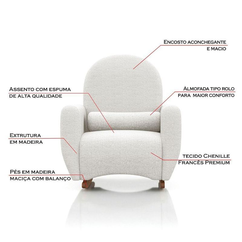 Poltrona Amamentação De Balanço Com Puff Lara Estrutura Reforçada Design Orgânico Chenille Off WhiteA Poltrona Orgânica de Balanço Lara com Puff em Tecido Chenille une design moderno, balanço relaxante e toque macio do chenille, criando um espaço aconchegante e elegante para seu ambiente.Com curvas orgânicas e proporções equilibradas, essa poltrona valoriza a decoração e proporciona uma experiência de conforto superior no dia a dia. O sistema de balanço torna os momentos de descanso ainda mais agradáveis, enquanto o puff complementa o conjunto oferecendo apoio extra e mais comodidade. Ideal para salas de estar, quartos ou cantinhos de leitura, é uma peça que combina sofisticação, funcionalidade e bem-estar em cada detalhe.PRINCIPAIS BENEFÍCIOSDesign orgânico moderno e sofisticadoSistema de balanço confortável e relaxantePuff incluso para apoio extraTecido chenille macio e aconcheganteIdeal para salas, quartos e espaços de leituraCARACTERÍSTICAS TÉCNICASModelo: LaraTipo: Poltrona orgânica de balanço com puffTecido: ChenilleCor: Off WhiteAcompanha puff: SimMEDIDAS DA POLTRONAAltura: 98 cmAltura do encosto: 59 cmLargura: 72 cmProfundidade: 82 cmLargura do assento: 51 cmMEDIDAS DO PUFFAltura: 37 cmDiâmetro: 40 cmCUIDADOS E CONSERVAÇÃOPara manter o produto sempre bonito e conservado, recomenda-se a limpeza com pano levemente umedecido, sem o uso de produtos abrasivos.ATENÇÃOIMAGENS MERAMENTE ILUSTRATIVAS. AS CORES PODEM VARIAR DE ACORDO COM A TELA, MONITOR, ILUMINAÇÃO DO AMBIENTE OU PERCEPÇÃO VISUAL. ITENS DECORATIVOS PRESENTES NAS IMAGENS NÃO ACOMPANHAM O PRODUTO.Poltrona Amamentação de Balanço com Puff Lara Estrutura Reforçada Design Orgânico Chenille Off White