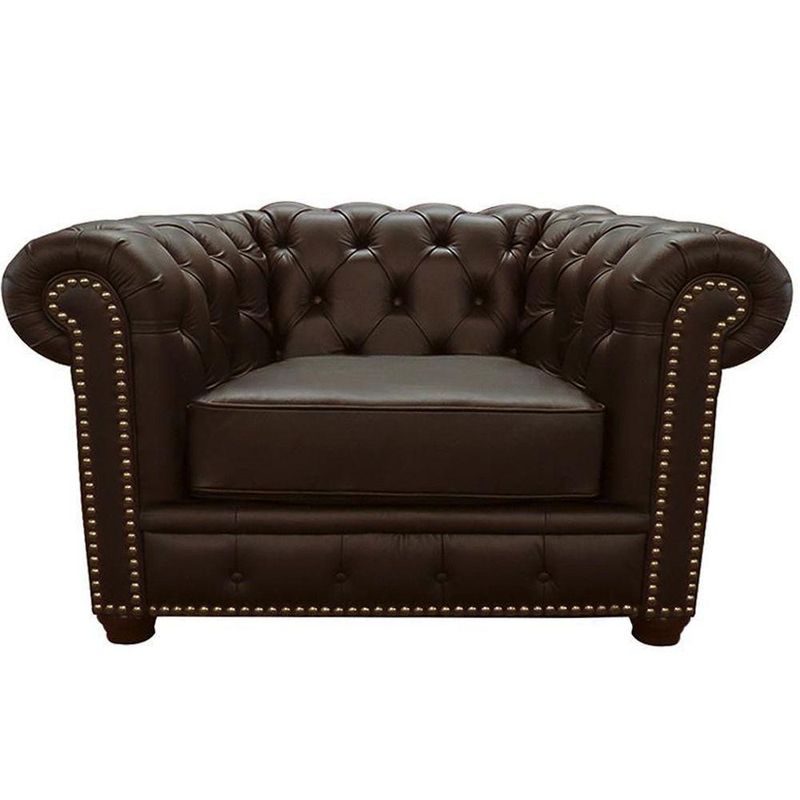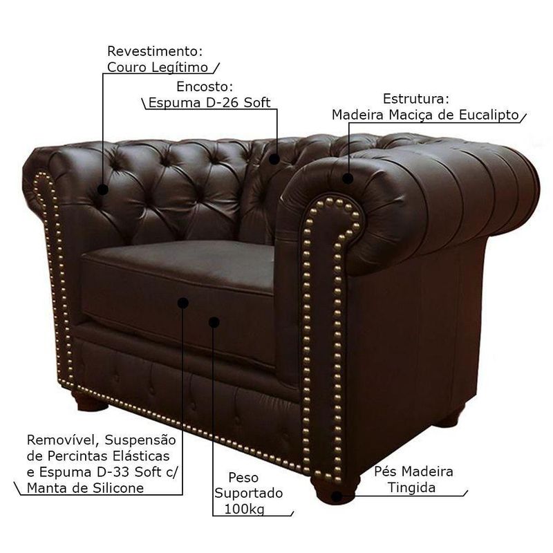 Poltrona Sala de Estar Chesterfield com Pés Madeira Couro Capuccino Gran BeloUm inovador que veio para atrair olhares com seu design super estiloso e atraente, além disso, é desenvolvido com espumas e couro que garante conforto e durabilidade. É um produto que foi fabricado pensando especialmente em você consumidor que exige qualidade e bom gosto!Especificações técnicas:- Marca: Gran Belo- Estrutura: Madeira Maciça de Eucalipto- Assento: Removível, Suspensão de Percintas Elásticas e Espuma D-33 Soft com Manta de Silicone- Encosto: Fixo, Espuma D-26 Soft- Braços: Espuma D-26 Soft- Material dos Pés: Madeira Tingida- Detalhes: Tachas Envelhecidas- Quantidade de Pés: 04- Revestimento: Couro- Cor: Capuccino Pigmentado- Peso Suportado: 100Kg- Peso do Produto: 50Kg- Conteúdo da Embalagem: 1 Poltrona- Necessita de Montagem: Não- Largura: 125cm- Altura: 80cm- Profundidade: 95cm- Largura de cada Braço: 35cm- Altura do Encosto: 34cm- Altura dos Pés: 8cm- Profundidade do Assento: 53cm- Largura do Assento: 55cm- Altura do Assento até o Chão: 46cm- Garantia: 3 Meses