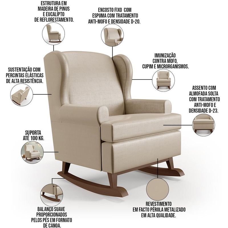 Um dos momentos mais importantes no desenvolvimento do bebê é a amamentação e ter um ambiente adequado para isso é importantíssimo. Pensando nisso a Poltrona De Amamentação Com Balanço Malu Base De Madeira P02 Suede Cinza - Lyam Decor vem para superar todas as expectativas quanto a qualidade e beleza, ela com certeza te auxiliará bastante trazendo muito aconchego! Seu balanço proporciona conforto e tranquilidade para o ninar dos pequenos, além de ser produzida com materiais de altíssima qualidade que contam com imunização contra mofo e cupim, ela ainda conversa muito bem com o restante da sua decoração iluminando e dando mais vida a sua casa. Não perca tempo e aproveite!! Dimensões da Poltrona (L x A x P) 66 x 90 x 80 cm Características: Estrutura em madeira de pinus e eucalipto de reflorestamento, com imunização contra mofo, cupim e microrganismos. Revestimento em Facto Pérola Metalizado de alta qualidade. Encosto fixo com percintas elásticas, espuma D-23 e tratamento antimofo. Assento com espuma D-20, tratamento antimofo e almofada solta. Sustentação com percintas elásticas de alta resistência. Base com pés em formato de canoa e balanço suave. Peso suportado: Até 100 kg. - Por se tratar de estofado as medidas podem ter uma pequena variação de até 3 cm. - A tonalidade do produto real poderá ter ligeira variação devido o lote de tecidos. A limpeza deve ser feita com pano umedecido em água limpa, sem esfregar, não utilizar produtos abrasivos, desengordurantes, álcool ou solvente. Nunca sentar nos braços ou encosto do produto. Manter em lugar livre de umidade e/ou exposição direta ao sol. Observações importantes: - Produto para uso residencial em ambiente interno, não devendo ficar exposto diretamente ao sol, calor e umidade excessivos. - Pode haver alguma diferença de tonalidade entre a imagem e o produto real, por conta do tratamento de imagens e a calibração de cores do seu monitor. - As imagens são meramente ilustrativas, não acompanham objetos de decoração e eletrônicos. - Ao receber a mercadoria, o cliente deve verificar as condições da embalagem, caso haja alguma avaria não assine o comprovante de recebimento e entre em contato com nossa loja para orientações. - Montagem, desmontagem e outras instalações serão de responsabilidade do cliente. Não nos responsabilizamos, no ato da entrega, por subir escadas/elevadores ou pelo transporte por guincho em apartamentos. Eventuais despesas são de responsabilidade do comprador. - Confira as dimensões do produto e certifique-se de que passará normalmente por supostos elevadores, portas, escadas e/ou corredores de sua residência. - Para mais informações, acesse nossa Central de Atendimento.