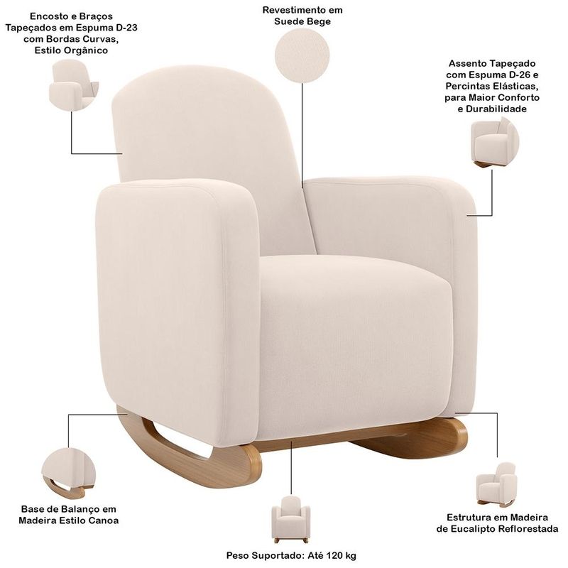 Mais do que uma poltrona de amamentação, um porto seguro para você e seu bebê. A Poltrona Saori envolve você com seu design orgânico de curvas suaves, enquanto o balanço suave e silencioso acalma e aconchega. A base em madeira estilo canoa traz leveza e um toque moderno ao quarto, ao passo que o estofamento com a espuma de alta resiliência D-26 oferece suporte perfeito para longas e preciosas horas de amamentação e conexão. Em outras palavras, uma poltrona de amamentação com balanço que entende a beleza e a intensidade da maternidade. Garanta a sua agora mesmo e aproveite todos os momentos de conexão e cuidado com seu bebê! Dimensões do produto (L x A x P) 67 x 98 x 92 cm Medidas Internas Assento livre (L x P): 51 x 56 cm Encosto livre (L x P): 51 x 61 cm Altura do chão ao assento: 47 cm Braço (L x A): 9 x 66 cm Características: Estrutura em madeira de eucalipto reflorestada. Revestimento em tecido Suede de alta qualidade na tonalidade Bege. Assento tapeçado com espuma D-26 e percintas elásticas, para maior conforto e durabilidade. Encosto e braços tapeçados em espuma D-23 com bordas curvas, estilo orgânico. Base de balanço em madeira estilo canoa. Peso suportado: Até 120 kg. - Por se tratar de estofado as medidas podem ter uma pequena variação de até 3 cm. - A tonalidade do produto real poderá ter ligeira variação devido o lote de tecidos. - Indicado para uso residencial, sua limpeza deve ser feita com pano levemente umedecido em água limpa, sem esfregar, não utilizar produtos abrasivos, desengordurantes, álcool ou solvente. Observações importantes: - Produto para uso residencial em ambiente interno, não devendo ficar exposto diretamente ao sol, calor e umidade excessivos. - Pode haver alguma diferença de tonalidade entre a imagem e o produto real, por conta do tratamento de imagens e a calibração de cores do seu monitor. - As imagens são meramente ilustrativas, não acompanham objetos de decoração e eletrônicos. - Ao receber a mercadoria, o cliente deve verificar as condições da embalagem, caso haja alguma avaria não assine o comprovante de recebimento e entre em contato com nossa loja para orientações. - Montagem, desmontagem e outras instalações serão de responsabilidade do cliente. Não nos responsabilizamos, no ato da entrega, por subir escadas/elevadores ou pelo transporte por guincho em apartamentos. Eventuais despesas são de responsabilidade do comprador. - Confira as dimensões do produto e certifique-se de que passará normalmente por supostos elevadores, portas, escadas e/ou corredores de sua residência.