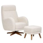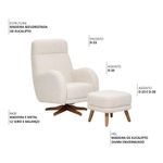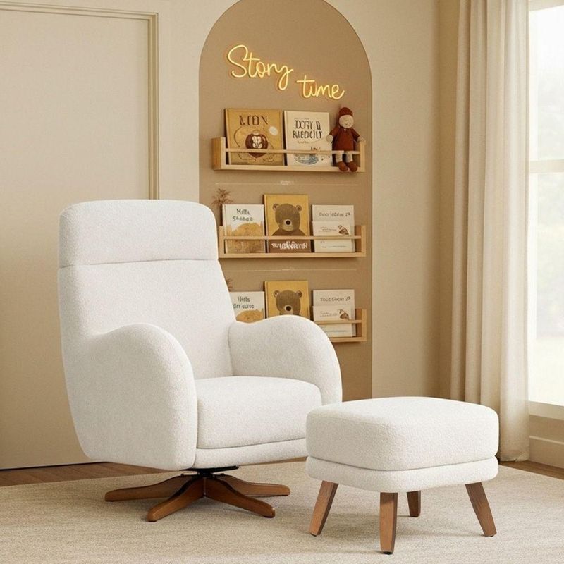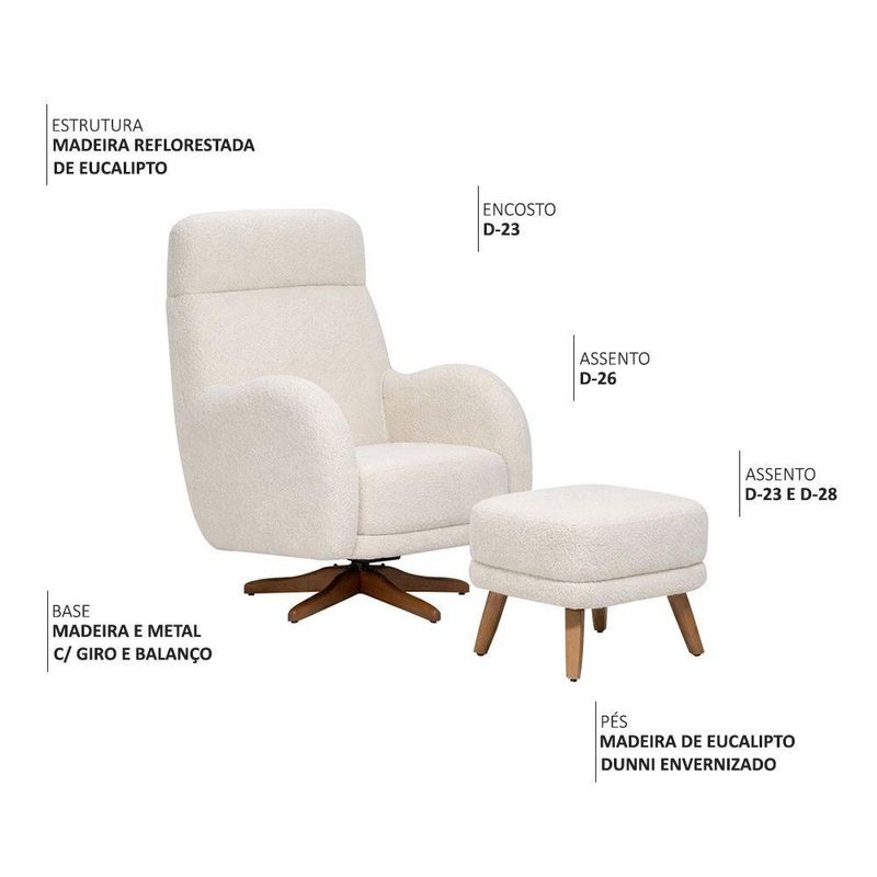 Poltrona De Amamentação Giratória Balanço E Puff Laura Bouclé Off White - Nexta CasaPoltrona de Amamentação com Puff Laura – Design delicado que ilumina o espaço e transforma o cantinho da amamentação em um refúgio.Transforme o momento de amamentação em uma experiência ainda mais confortável, acolhedora e relaxante!Descrição do ProdutoEssa poltrona de amamentação com puff foi criada para acompanhar os momentos mais delicados da maternidade. Desde o primeiro olhar, ela transmite calma, mas é na experiência que revela todo o seu valor. Sua estrutura reforçada e bem equilibrada oferece e estabilidade, permitindo que a mamãe se acomode com confiança em cada amamentação. O encosto alto apoia corretamente as costas e o pescoço, ajudando a manter uma postura confortável mesmo durante longos períodos, e para ajudar a manter a mamãe ainda mais relaxada acompanha o puff para que possa apoiar as pernas e ter uma amamentação tranquila. O assento macio, com espuma de alta qualidade, mantém o conforto sem deformar, garantindo durabilidade e resistência ao uso diário. A base foi pensada para proporcionar um movimento suave e relaxante, ideal para acalmar o bebê e criar uma sensação de aconchego que envolve mãe e filho!Características Técnicas Estrutura: Madeira de eucalipto e partes em placas MDF, grampeadas com grampos galvanizados Assento: Espuma D-26 HR de 07cm. Encosto: Espuma Soft D-23 de 04cm. Braço: Espuma D-23 de 2cm. Assento Puff: Espuma D-23 e D-28. Revestimento: Bouclé. Base da Poltrona: Madeira e Metal, 5 hastes com giro e balanço. Pés do Puff: Madeira de Eucalipto dunni envernizado. Cor Pés/Base: Castanho. Peso Suportado: Até 120 kg sem impacto. Medidas da Poltrona Altura Total: 111 cm Largura: 70 cm Profundidade: 83 cm Peso: 35,2 kg Altura do Encosto: 69 cm Altura do Assento ao Chão: 45 cm Largura do Assento: 47 cm Profundidade do Assento: 53 cm Altura dos Pés/Base: 20 cm Altura do Braço ao Assento: 24 cm Largura do Braço: 11 cm Medidas do Puff Altura Total: 41 cm Largura: 52 cm Profundidade: 41 cm Peso: 7 kg Altura dos Pés: 17 cm Diferenciais Design clássico e versátil, pode ser usada nos mais diversos ambientes quando a mãe não precisar mais amamentar. Percintas elásticas de nylon no assento e encosto para maior sustentação. Revestimento que proporciona toque macio e aconchego. Base giro e balanço suave, a cada leve embalo, o bebê relaxa, e a mamãe respira mais tranquila. Quantidade de Volumes: 2. Necessita de montagem – Sim, apenas fixação dos pés do puff! Cuidados Utilizar um pano levemente umedecido com água, seguido de pano seco. Evitar exposição ao sol para preservar a cor vibrante do tecido. Não sentar nos braços ou encosto do produto. Não usar produtos abrasivos ou escovas. Garantia 3 meses contra de fabricação. Observações Imagens ilustrativas; tonalidade pode variar devido à configuração de cores da tela. Objetos de decoração não inclusos. Produtos enviados embalados com , reduzindo riscos de danos. Verificar as condições da embalagem na e reportar danos no . até a porta de entrada ou portaria. Confirme as dimensões e compatibilidade do de instalação. Não nos responsabilizamos por montagem, desmontagem, instalação ou por escadas/elevadores.