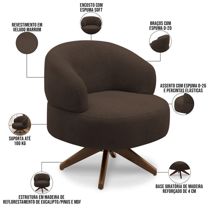 A Poltrona Decorativa Sala de Estar Living Seven é a peça perfeita para adicionar elegância e estilo contemporâneo ao seu ambiente. Com base giratória de madeira e encosto em espuma soft, essa poltrona oferece conforto excepcional para relaxar e aproveitar momentos de descanso. O assento, com espuma D-26 e molas espirais, proporciona suporte adequado para longas horas de uso, seja para ler um livro, assistir TV ou simplesmente relaxar. Além do conforto, essa poltrona giratória se destaca pela sua aparência sofisticada e moderna expressos na combinação de materiais de alta qualidade que resulta em um design orgânico e elegante, que certamente será o destaque do seu ambiente, desde sala de estar, quarto, recepção e living. Uma poltrona decorativa versátil assim só pode ser Lyam Decor. Então, aproveite e faça dela o ponto de destaque do seu espaço! Dimensões do produto (L x A x P) 75 x 83 x 75 cm Medidas Internas: Altura do chão ao assento: 47 cm Altura do encosto: 37 cm Largura do assento: 50 cm Características: Estrutura em madeira de reflorestamento de eucalipto, pinus e MDF. Revestimento em Veludo na cor Marrom. Design orgânico com linhas curvas. Assento com Espuma D-26 e percintas elásticas. Encosto com Espuma Soft. Braças com espuma D-20. Peso suportado: Até 100 kg. Base giratória de madeira reforçado de 4 cm. Giro 360º - Por se tratar de estofado as medidas podem ter uma pequena variação de até 3 cm. - A tonalidade do produto real poderá ter ligeira variação devido o lote de tecidos. Observações importantes: - Produto para uso residencial em ambiente interno, não devendo ficar exposto diretamente ao sol, calor e umidade excessivos. - Pode haver alguma diferença de tonalidade entre a imagem e o produto real, por conta do tratamento de imagens e a calibração de cores do seu monitor. - As imagens são meramente ilustrativas, não acompanham objetos de decoração e eletrônicos. - Ao receber a mercadoria, o cliente deve verificar as condições da embalagem, caso haja alguma avaria não assine o comprovante de recebimento. - Montagem, desmontagem e outras instalações serão de responsabilidade do cliente. Não nos responsabilizamos, no ato da entrega, por subir escadas/elevadores ou pelo transporte por guincho em apartamentos. Eventuais despesas são de responsabilidade do comprador. - Confira as dimensões do produto e certifique-se de que passará normalmente por supostos elevadores, portas, escadas e/ou corredores de sua residência.