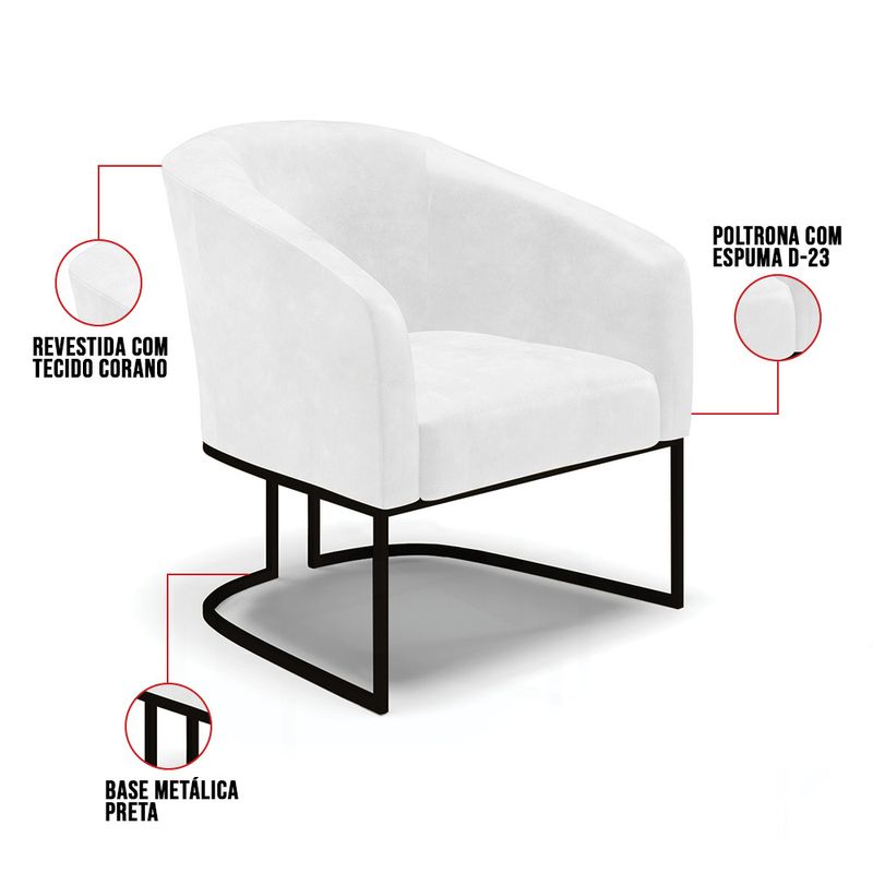 Poltrona Stella Corano Base Metálica Industrial Preta A Poltrona Stella com é a escolha ideal para quem busca um móvel que une design moderno e sofisticação. Seu revestimento em Corano e a base metálica preta proporcionam um visual elegante, que combina perfeitamente com diversos ambientes, como sala de estar, recepções e até mesas de jantar. A Poltrona Stella oferece durabilidade e resistência. Sua estrutura em madeira de reflorestamento de eucalipto e chapas de MDF garante a sustentabilidade e robustez do produto. Ela é capaz de suportar até 120 kg, proporcionando segurança e estabilidade ao usuário. O conforto também é um dos principais atributos desta poltrona. Com acabamento reforçado e espuma de alta qualidade (D23), ela proporciona uma sensação de maciez que convida ao descanso. O assento com percintas elásticas traz flexibilidade adicional, tornando a experiência ainda mais agradável. Seu formato arredondado oferece um aconchego extra, tornando-a perfeita para descansar e relaxar. Não perca a oportunidade de garantir a sua Poltrona Stella Corano com Base Metálica Industrial Preta na D'Rossi. Aproveite as condições incríveis de pagamento e leve para sua casa um produto que alia estilo, conforto e durabilidade. Além disso, confira nossa linha completa de decoração para complementar o seu ambiente. Dimensões da Poltrona: Altura total: 81 cm Largura total: 68 cm Profundidade total: 60 cm Altura do encosto: 40 cm Largura do assento: 45 cm Profundidade do assento: 45 cm Altura do chão ao assento: 45 cm Espessura do assento: 15 cm Tamanho dos pés: 30 cm Altura do chão ao braço: 70 cm Altura interna do braço: 28 cm Espessura do braço: 7 cm Peso: 21 kg Especificações do Produto Estrutura: Madeira Eucalipto Espuma: D-23 Tecido: Corano Tipo de pés: Base Industrial Preto Peso suportado: Até 120 Kg Garantia: 90 dias contra defeito de fabricação Montagem: O produto vai montado, apenas parafusar a base Instruções de limpeza: Utilizar um pano limpo e levemente úmido Você irá receber: 01 Volume com 01 Poltrona