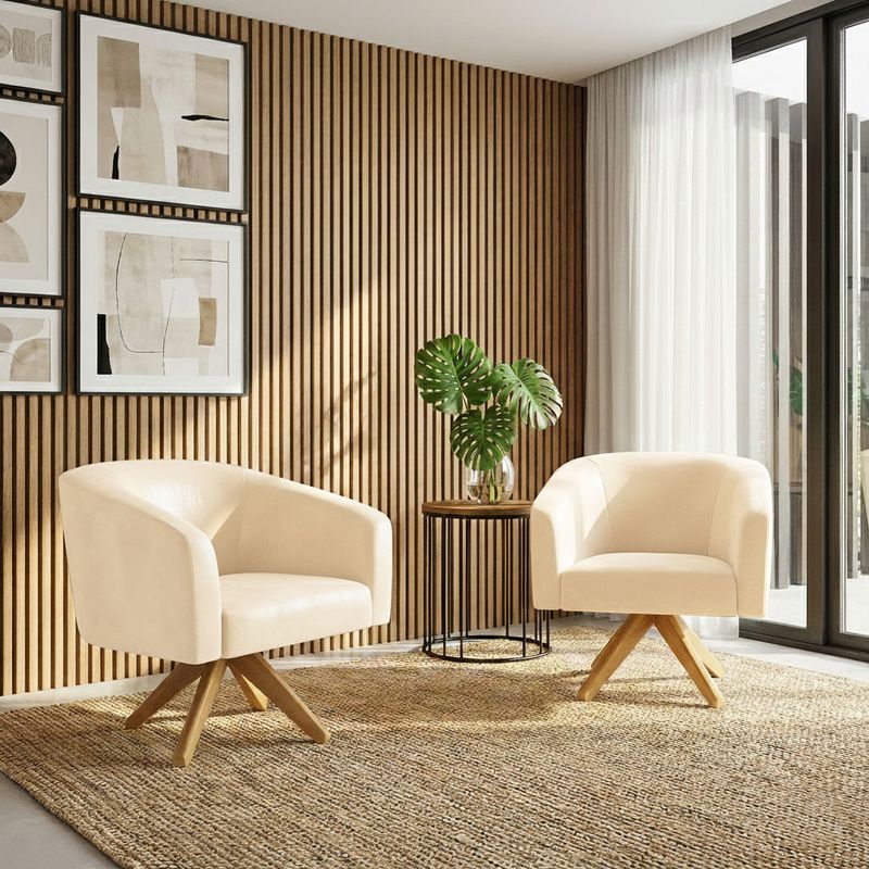O Kit 2 Poltronas Stella revestida em Sintético PU Bege é adequada para quem busca um ambiente refinado e funcional. Seu design destaca a estrutura em madeira de eucalipto, reconhecida pela resistência e durabilidade, aliada à espuma D-26 que garante aconchego equilibrado no uso diário. O revestimento adiciona textura suave e toque aconchegante, criando uma atmosfera sofisticada e convidativa. A base giratória de madeira realça o estilo do produto e oferece liberdade de movimento, garantindo praticidade no dia a dia. Com encosto e assento fixos, a Stella proporciona sustentação firme e ergonomia perfeita para longas conversas à mesa. Suporta até 120 kg, sendo ideal para uso residencial ou corporativo. Cada detalhe foi pensado para combinar charme e funcionalidade em um único móvel. Dimensões do Produto: Altura Total: 81 cm Largura Total: 69 cm Profundidade Total: 60 cm Altura do Encosto: 40 cm Largura do Assento: 45 cm Profundidade do Assento: 45 cm Altura do chão ao Assento: 45 cm Espessura do Assento: 15 cm Espessura do braço: 7 cm Altura do chão ao braço: 70 cm Tamanho dos pés: 30 cm Altura interna do braço: 28 cm Peso: 20 kg Especificações do Produto: Estrutura: Madeira de Eucalipto Material do Estofamento: Assento Espuma D-26 (alta densidade) Braço e encosto D-23 Revestimento: Sintético PUPeso Máximo Suportado: Até 120 Kg Tipo de Pés: Base Giratória MA30 Material/Acabamento dos Pés: Madeira de Eucalipto Inclui Almofada Extra: Não Tipo de Encosto: Fixo Tipo de Assento: Fixo, percintas elásticas Com Apoio de Pés: Não Com Altura Ajustável: Não É Reclinável: Não É Giratória: Sim Diferenciais: Design sofisticado e aconchegante; Combinação perfeita em qualquer ambiente; Estrutura reforçada em madeira de eucalipto. Complexidade da Montagem: Baixa Montagem: O produto vai montado, apenas parafusar a base Garantia: 90 dias contra defeito de fabricação Instruções de Limpeza: Utilizar um pano limpo e levemente úmido Quantidade de Volumes: 2 Caixas Medida das Embalagens: Caixa 1: 72 cm x 66 cm x 58 cm; Caixa 2: 72 cm x 66 cm x 58 cm Peso das Embalagens: 44 kg Entrega: É feita somente até o térreo ou portaria. Confira sempre as medidas das embalagens para assegurar que o produto passe por portas e escadas do local.