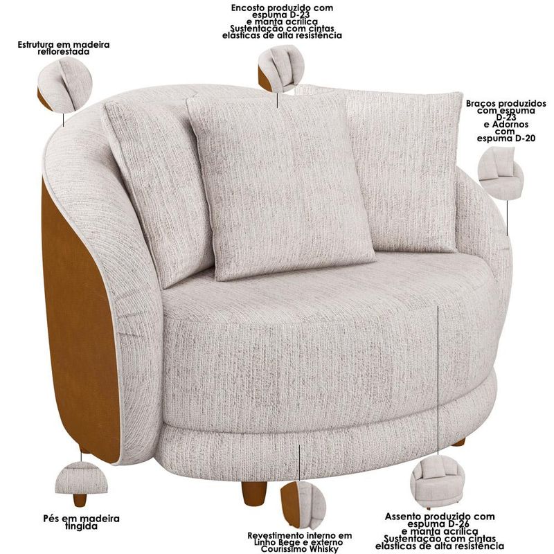 A Poltrona Witta promete marcar com elegância e versatilidade á presença em diversos estilos de decoração. O modelo certo é essencial para o bom funcionamento dos cômodos da casa, por isso, uma poltrona bem estruturada é mais do que necessária na sala de estar! Extremamente elegante, e que transmite a nobreza que o seu ambiente precisa! Tudo isso para gerar conforto para você e sua família em uma peça única feita com todo cuidado e observada nos detalhes para superar as suas expectativas! Adquira a sua! Dimensões do produto (L x A x P) 122 x 81 x 110 cm Medidas internas: Altura do chão ao assento: 46 cm Profundidade do assento: 50 cm Largura do assento: 93 cm Altura do encosto: 39 cm Largura do encosto: 93 cm Características: Estrutura em madeira de reflorestamento, imunizada contra mofo. Revestimento em interno em Linho Bege e externo em Couríssimo Whisky. Sustentação do assento e encosto com cintas elásticas de alta resistência. Encosto fixo com espuma D-23 com manta acrílica. Assento com espuma D-26 com manta acrílica. Braços com espuma D-23, e adornos com espuma D-20. Suporta até 120 kg. Acabamento inferior em Kami. Pés em madeira tingida. - Por se tratar de estofado as medidas podem ter uma pequena variação de até 3 cm. - A tonalidade do produto real poderá ter ligeira variação devido o lote de tecidos. Produto entregue montado. Indicado para uso residencial, sua limpeza deve ser feita com pano umedecido em água limpa, sem esfregar, não utilizar produtos abrasivos, desengordurantes, álcool ou solvente. Nunca sentar nos braços ou encosto do produto. Manter em lugar livre de umidade e/ou exposição direta ao sol. Observações importantes: - Produto para uso residencial em ambiente interno, não devendo ficar exposto diretamente ao sol, calor e umidade excessivos. - Pode haver alguma diferença de tonalidade entre a imagem e o produto real, por conta do tratamento de imagens e a calibração de cores do seu monitor. - As imagens são meramente ilustrativas, não acompanham objetos de decoração e eletrônicos. - Ao receber a mercadoria, o cliente deve verificar as condições da embalagem, caso haja alguma avaria não assine o comprovante de recebimento. - Montagem, desmontagem e outras instalações serão de responsabilidade do cliente. Não nos responsabilizamos, no ato da entrega, por subir escadas/elevadores ou pelo transporte por guincho em apartamentos. Eventuais despesas são de responsabilidade do comprador. - Confira as dimensões do produto e certifique-se de que passará normalmente por supostos elevadores, portas, escadas e/ou corredores de sua residência.