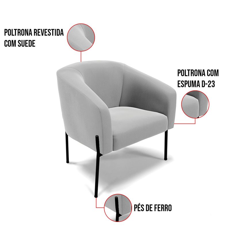 A Poltrona Stella é uma poltrona que combina elegância, conforto e durabilidade. Ela tem um design moderno e sofisticado, com pés de ferro lateral preto e revestimento em tecido Suede Cinza, que harmonizam com qualquer ambiente. Ela é ideal para sala de estar, recepções, mesa de jantar ou qualquer outro espaço que você queira decorar com estilo e bom gosto. Ela tem uma estrutura em madeira de reflorestamento eucalipto, que garante a resistência e a sustentabilidade do produto. Ela suporta até 120 kg de peso, podendo ser utilizada por pessoas de diferentes biotipos. Ela tem um acabamento reforçado e espuma de qualidade D23, que oferece maciez e aconchego. Tem pés em aço carbono e pintura eletrostática, que protegem o produto contra corrosão e desgaste. Ela tem assento com persintas elásticas, que proporcionam flexibilidade e conforto. A Poltrona Stella é um produto de alta qualidade, beleza e funcionalidade. Ela é fácil de transportar, pois tem um peso leve e um tamanho compacto. A Poltrona Stella é um produto que vai fazer a diferença na sua decoração e no seu bem-estar. Ela vai trazer charme, conforto e durabilidade para o seu ambiente. Aproveite essa oferta e leve para casa uma poltrona de qualidade por um preço incrível. Essa é a sua chance de ter uma poltrona maravilhosa por um preço imperdível. Corra e garanta seu Kit 02 Poltronas antes que acabe o estoque! Dimensões da Poltrona: Altura total: 81 cm Largura total: 77 cm Profundidade total: 60 cm Altura do encosto: 40 cm Largura do assento: 45 cm Profundidade do assento: 45 cm Altura do chão ao assento: 45 cm Espessura do assento: 15 cm Tamanho dos pés: 30 cm Altura do chão ao braço: 70 cm Altura interna do braço: 28 cm Espessura do braço: 7 cm Peso: 21 kg Especificações do Produto Estrutura: Madeira Eucalipto Espuma: D-23 Tecido: Suede Tipo de pés: Pés de Ferro Lateral Peso suportado: Até 120 Kg Garantia: 90 dias contra defeito de fabricação Montagem: O produto vai montado, apenas parafusar a os pés Instruções de limpeza: Utilizar um pano limpo e levemente úmido Você irá receber: 01 Poltrona - Entregue em: 01 Volume