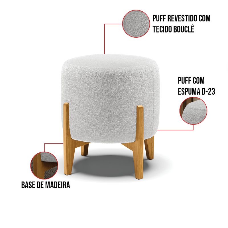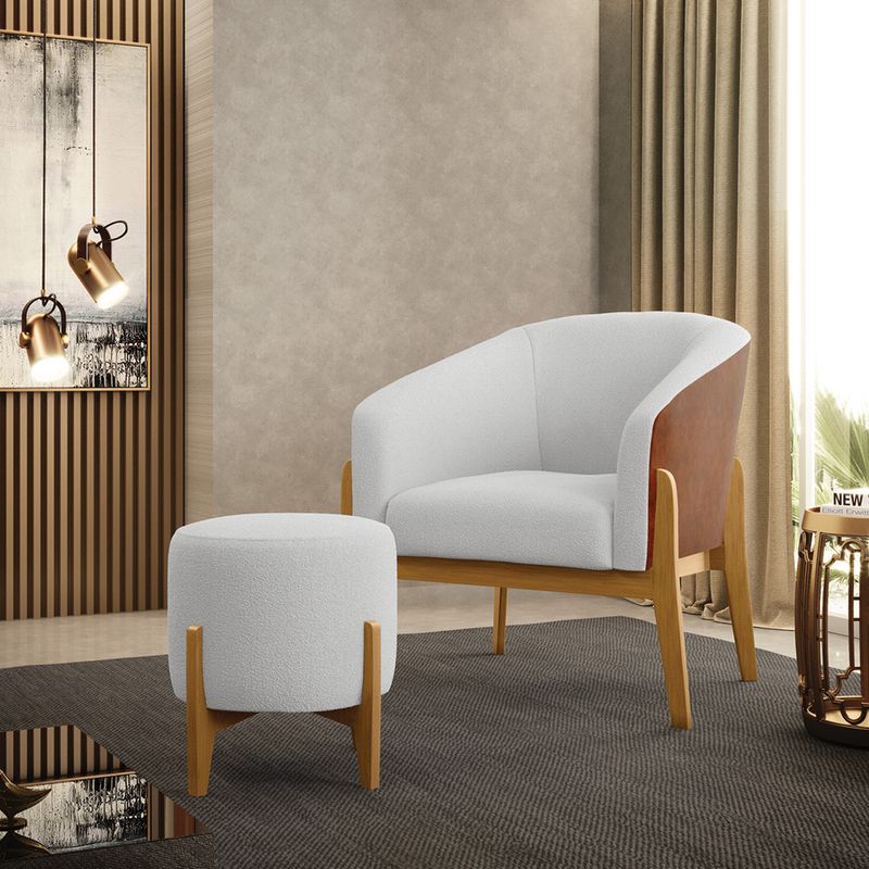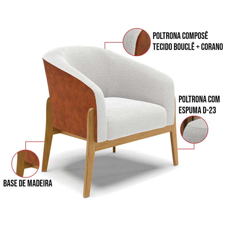 A Poltrona Stella é a combinação perfeita de conforto, elegância e modernidade. Seu design curvo e marcante oferece uma sensação única de aconchego, como um abraço acolhedor, tornando-se a peça ideal para compor sua decoração com estilo e sofisticação. Revestida em Sintético PU Nozes com Bouclê Off White, a poltrona traz o toque da tendência atual. Seja na sala de estar, quarto ou escritório, ela se adapta com facilidade. Sua estrutura robusta é sustentada por uma base de madeira (fixa), unindo resistência e design contemporâneo. A tendência desse estilo minimalista ganha destaque, conferindo sofisticação ao móvel, que é perfeito para qualquer espaço que exija funcionalidade e bom gosto. Com enchimento em espuma D-23 no encosto e assento, o kit Poltrona Stella garante o máximo de conforto, mesmo em longos períodos de uso. O conjunto, acompanha um lindo puff que é ideal para você apoiar os pés, garantindo descanso absoluto. Além desse modelo, também temos várias opções em base/pés e uma grande variedade de tecido/cores para atender ao seu estilo e conforto. E para deixar seu ambiente ainda mais harmonioso, oferecemos também kits especiais no mesmo design. Caso queira ajuda para escolher a melhor opção para o seu espaço, estamos à disposição! OBSERVAÇÃO IMPORTANTE: A entrega é realizada no endereço informado, não realizamos o transporte para andares superiores, como subir escadas, elevadores ou guinchos. Não realizamos montagens, desmontagens ou instalações. Todos esses serviços são de responsabilidade do comprador. Dimensões da Poltrona: Altura Total: 81 cm Largura Total: 85 cm Profundidade Total: 60 cm Altura do Encosto: 40 cm Largura do Assento: 45 cm Profundidade do Assento: 45 cm Altura do chão ao Assento: 45 cm Espessura do Assento: 15 cm Espessura do braço: 7 cm Altura do chão ao braço: 52 cm Altura interna do braço: 28 cm Tamanho dos pés: 30 cm Peso: 20 kg Dimensões do Puff: Altura Total: 45 cm Largura Total: 42 cm Profundidade Total: 42 cm Altura do chão ao Assento: 45 cm Espessura do Assento: 31 cm Tamanho dos pés: 25 cm Peso: 8 kg Especificações do Produto: Estrutura: Madeira Eucalipto Espuma: D-23 Tecido: Sintético PU Nozes com Bouclê Peso Suportado: Até 120 Kg Tipo de Pés: Base de Madeira Tipo de Encosto da poltrona: Fixo Tipo de Assento da poltrona: Fixo Complexidade da Montagem: Baixo Montagem: O produto vai montado, apenas parafusar a base da poltrona Garantia: 90 dias contra defeito de fabricação Instruções de Limpeza: Utilizar um pano limpo e levemente úmido Você irá Receber: 01 Poltrona e 01 Puff - Entregue em: 02 Volumes