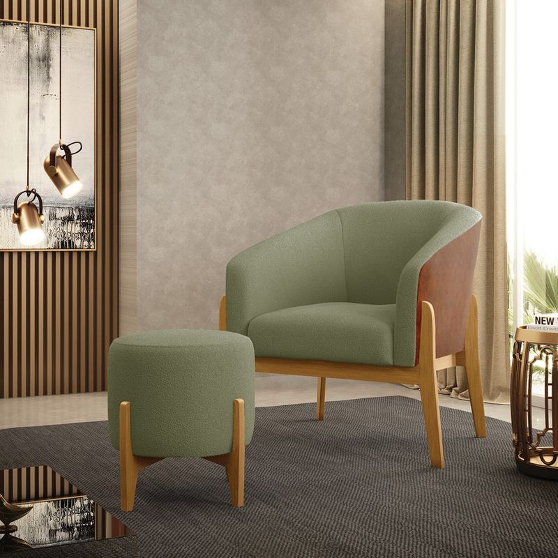 A Poltrona Stella é a combinação perfeita de conforto, elegância e modernidade. Seu design curvo e marcante oferece uma sensação única de aconchego, como um abraço acolhedor, tornando-se a peça ideal para compor sua decoração com estilo e sofisticação. Revestida em Sintético PU Nozes com Bouclê Pistache, a poltrona traz o toque da tendência atual. Seja na sala de estar, quarto ou escritório, ela se adapta com facilidade. Sua estrutura robusta é sustentada por uma base de madeira (fixa), unindo resistência e design contemporâneo. A tendência desse estilo minimalista ganha destaque, conferindo sofisticação ao móvel, que é perfeito para qualquer espaço que exija funcionalidade e bom gosto. Com enchimento em espuma D-23 no encosto e assento, o kit Poltrona Stella garante o máximo de conforto, mesmo em longos períodos de uso. O conjunto, acompanha um lindo puff que é ideal para você apoiar os pés, garantindo descanso absoluto. Além desse modelo, também temos várias opções em base/pés e uma grande variedade de tecido/cores para atender ao seu estilo e conforto. E para deixar seu ambiente ainda mais harmonioso, oferecemos também kits especiais no mesmo design. Caso queira ajuda para escolher a melhor opção para o seu espaço, estamos à disposição! OBSERVAÇÃO IMPORTANTE: A entrega é realizada no endereço informado, não realizamos o transporte para andares superiores, como subir escadas, elevadores ou guinchos. Não realizamos montagens, desmontagens ou instalações. Todos esses serviços são de responsabilidade do comprador. Dimensões da Poltrona: Altura Total: 81 cm Largura Total: 85 cm Profundidade Total: 60 cm Altura do Encosto: 40 cm Largura do Assento: 45 cm Profundidade do Assento: 45 cm Altura do chão ao Assento: 45 cm Espessura do Assento: 15 cm Espessura do braço: 7 cm Altura do chão ao braço: 52 cm Altura interna do braço: 28 cm Tamanho dos pés: 30 cm Peso: 20 kg Dimensões do Puff: Altura Total: 45 cm Largura Total: 42 cm Profundidade Total: 42 cm Altura do chão ao Assento: 45 cm Espessura do Assento: 31 cm Tamanho dos pés: 25 cm Peso: 8 kg Especificações do Produto: Estrutura: Madeira Eucalipto Espuma: D-23 Tecido: Sintético PU Nozes com Bouclê Peso Suportado: Até 120 Kg Tipo de Pés: Base de Madeira Tipo de Encosto da poltrona: Fixo Tipo de Assento da poltrona: Fixo Complexidade da Montagem: Baixo Montagem: O produto vai montado, apenas parafusar a base da poltrona Garantia: 90 dias contra defeito de fabricação Instruções de Limpeza: Utilizar um pano limpo e levemente úmido Você irá Receber: 01 Poltrona e 01 Puff - Entregue em: 02 Volumes