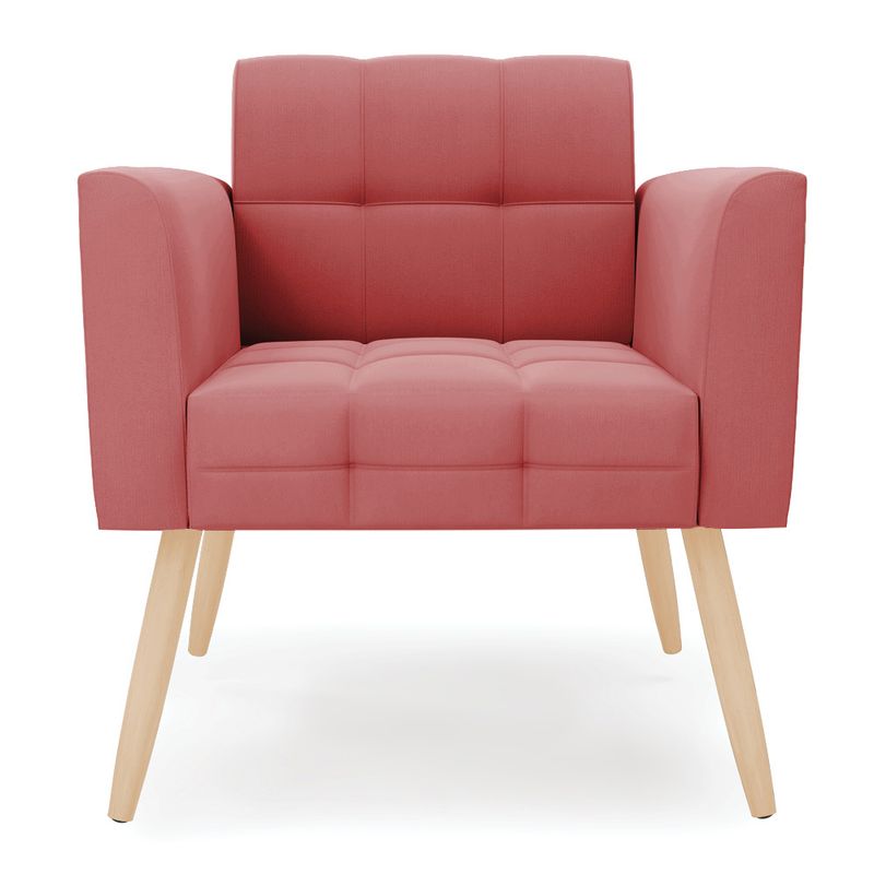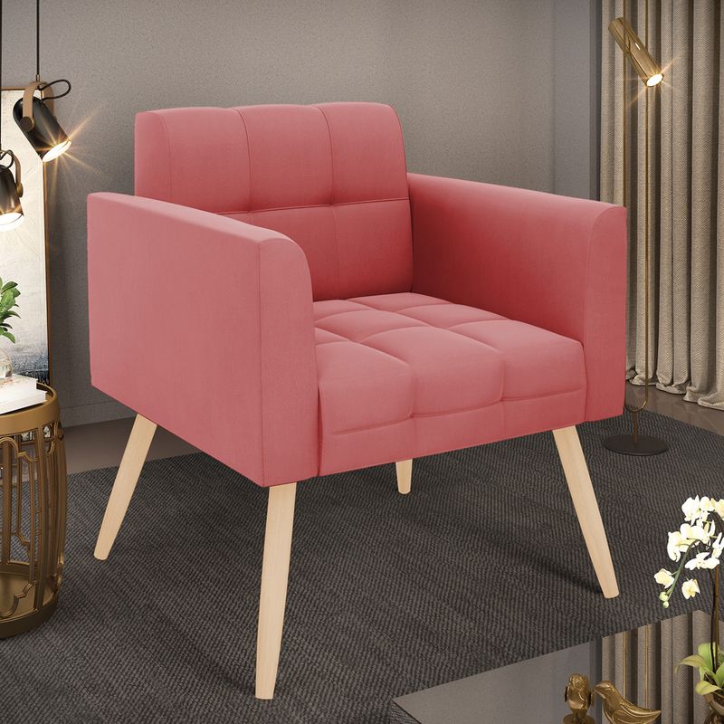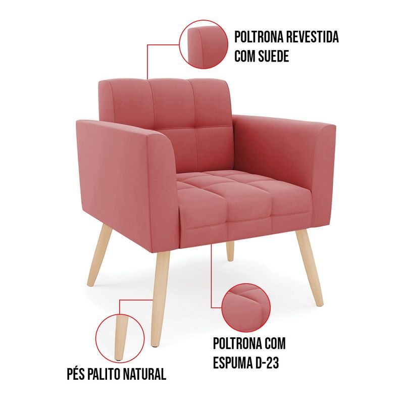 Você gosta de colecionar vários momentos memoráveis com sua família e amigos? Que tal recebê-los, com móveis de altíssima qualidade que só a D'Rossi tem? A Poltrona Elisa é adequada para você! Seu design retrô é a grande tendência do momento. Pode ser usada em diversos espaços da casa, em salas, hall de entrada, quartos, cozinhas, varanda, sacada, escritório, dentre outros. Contém as seguintes características: A estrutura é feita de madeira de Eucalipto 100% de reflorestamento, e os Pés Palito Natural, além de serem resistentes e duráveis, suportam em média até 120 kg. Assento, encosto e braços, contém enchimento de espuma D-23 e é estofada em tecido Suede, no tom Rosê, que oferece muito conforto e resistência ao sentar, com aquela sensação de maciez e aconchego. Possui também, detalhes de costura no encosto e assento, resultando em um acabamento impecável, conferindo muito mais valor e elegância ao seu espaço. Para complementar a decoração com essa linda poltrona, a dica é utilizar mantas, almofadas ou vasinho de flor. E pronto, seu cantinho estará perfeito para descansar e relaxar! Aqui, você encontra várias opções, para que seus amigos e familiares se sintam acolhidos. Garanta já sua Poltrona. Dimensões da Poltrona: Altura total: 82 cm Largura total: 66 cm Profundidade total: 63 cm Altura do encosto: 35 cm Largura do assento: 46 cm Profundidade do assento: 47 cm Altura do chão ao assento: 47 cm Espessura do assento: 17 cm Tamanho dos pés: 30 cm Espessura do braço: 10 cm Peso: 13 kg Especificações do Produto Estrutura: Madeira Eucalipto Espuma: D-23 Tecido: Suede Tipo de pés: Pés Palito Natural Peso suportado: Até 120 Kg Garantia: 90 dias contra defeito de fabricação Montagem: O produto vai montado, apenas rosquear os pés Instruções de limpeza: Utilizar um pano limpo e levemente úmido Você irá receber: 01 Poltrona - Entregue em: 01 Volume Observações Relevantes - Todos os produtos vão embalados com total segurança; - As cores dos produtos podem sofrer alterações dependendo do seu monitor; - Para futuras compras, não garantimos a mesma tonalidade de cor, pois existe variação a cada lote do fabricante do tecido; - As imagens são meramente ilustrativas, não acompanham objetos de decoração e eletros; - Confira as dimensões do produto no momento da compra e certifique-se de que passará normalmente por escadas, elevadores, portas e corredores; - Importante: Por se tratar de estofado as medidas podem ter uma pequena variação em até 3 cm; - Não nos responsabilizamos no ato da entrega por montagens, desmontagens, instalações de produtos; - Não nos responsabilizamos no ato da entrega por subir escadas, elevadores, nem utilização de guinchos ou equipamentos similares para acesso a pisos superiores em apartamentos; - A entrega do produto é realizada em todo território nacional, até onde as rodovias alcançam, entregas fluviais ou aéreas devem ser cotadas a parte; - Observando as orientações acima, evita-se futuros desagrados ou imprevistos com a entrega do produto. Havendo despesas adicionais, serão de responsabilidade do cliente;