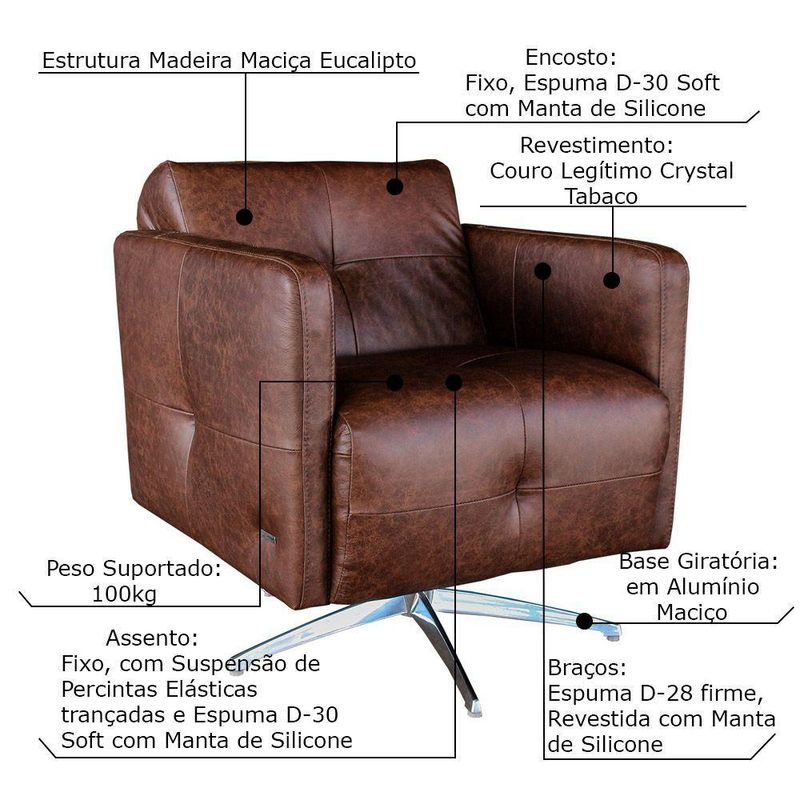 Poltrona Giratória para Sala de Estar Astana Couro Gran BeloSe você quer inovar o seu espaço e deixar o visual do ambiente com grande estilo a Poltrona Astana é a escolha certa, é uma peça que foi fabricada com as melhores matérias primas de altíssima qualidade, com revestimento em couro e base giratória em alumínio que tem sinônimo de durabilidade e que garante total resistência, além disso, seu estofado é com espuma D-30 Soft que proporciona conforto e maciez inigualável!Especificações técnicas:- Marca: Gran Belo- Estrutura: Madeira Maciça de Eucalipto- Assento: Fixo, com Suspensão de Percintas Elásticas Trançadas e Espuma D-30 Soft com Manta de Silicone- Encosto: Fixo, com Enchimento de Espuma D-30 Soft Revestida com Manta de Silicone- Braços: Espuma D-28 Firme, Revestida com Manta de Silicone- Material do Pé: Base Giratória em Alumínio Maciço- Quantidade de Pés: 05 Pontas- Revestimento: Couro- Cor: - Peso Suportado: 100Kg- Peso do Produto: 25Kg- Conteúdo da Embalagem: 1 Poltrona- Necessita de Montagem: Não- Largura: 70Cm- Altura: 75Cm- Profundidade: 75Cm- Largura do Assento: 60Cm- Profundidade do Assento: 53Cm- Altura do Assento até o Chão: 46Cm - Largura de cada Braço: 5Cm- Altura do Encosto: 29Cm- Altura do Pé: 23Cm- Garantia: 3 Meses