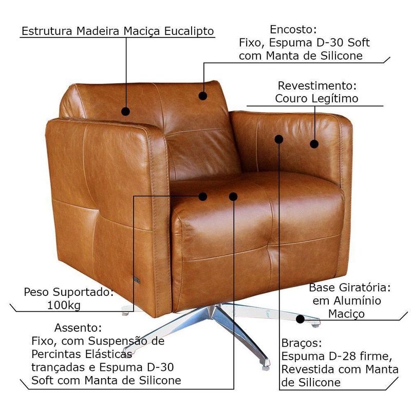 Poltrona Giratória para Sala de Estar Astana Couro Marrom Gran BeloSe você quer inovar o seu espaço e deixar o visual do ambiente com grande estilo a Poltrona Astana é a escolha certa, é uma peça que foi fabricada com as melhores matérias primas de altíssima qualidade, com revestimento em couro e base giratória em alumínio que tem sinônimo de durabilidade e que garante total resistência, além disso, seu estofado é com espuma D-30 Soft que proporciona conforto e maciez inigualável!Especificações técnicas:- Marca: Gran Belo- Estrutura: Madeira Maciça de Eucalipto- Assento: Fixo, com Suspensão de Percintas Elásticas Trançadas e Espuma D-30 Soft com Manta de Silicone- Encosto: Fixo, com Enchimento de Espuma D-30 Soft Revestida com Manta de Silicone- Braços: Espuma D-28 Firme, Revestida com Manta de Silicone- Material do Pé: Base Giratória em Alumínio Maciço- Quantidade de Pés: 05 Pontas- Revestimento: Couro- Cor: Marrom- Peso Suportado: 100Kg- Peso do Produto: 25Kg- Conteúdo da Embalagem: 1 Poltrona- Necessita de Montagem: Não- Largura: 70Cm- Altura: 75Cm- Profundidade: 75Cm- Largura do Assento: 60Cm- Profundidade do Assento: 53Cm- Altura do Assento até o Chão: 46Cm - Largura de cada Braço: 5Cm- Altura do Encosto: 29Cm- Altura do Pé: 23Cm- Garantia: 3 Meses
