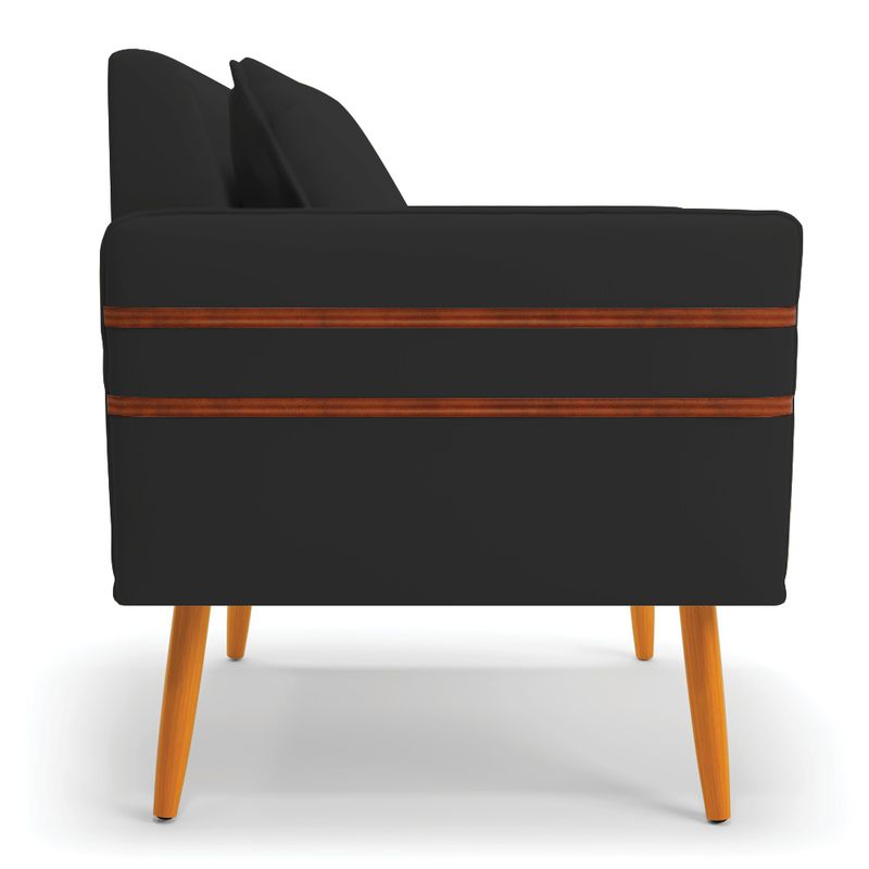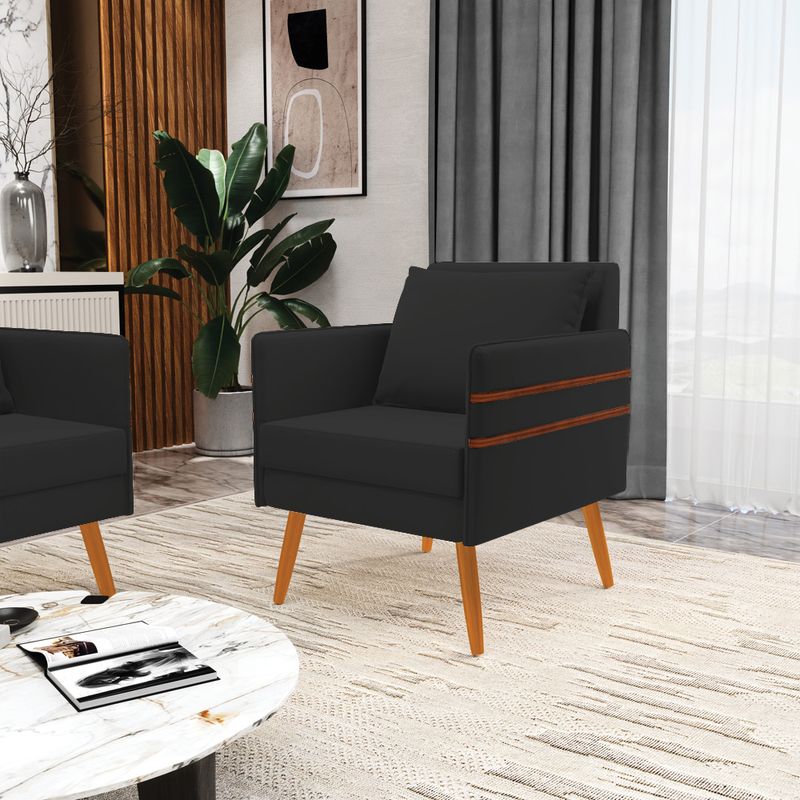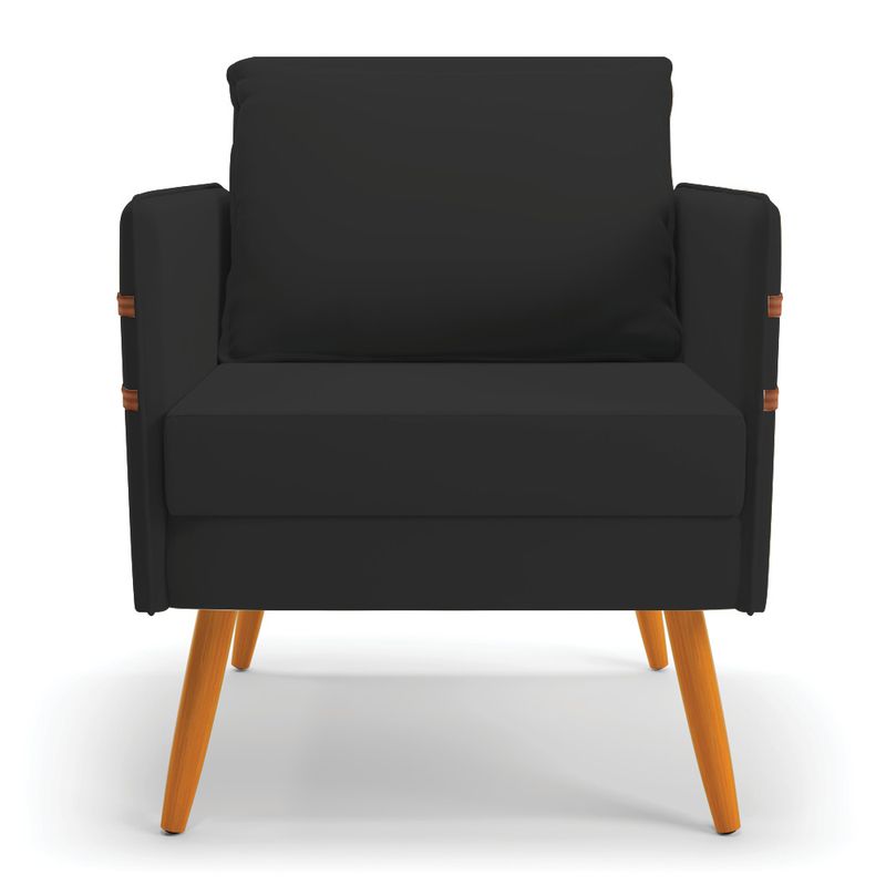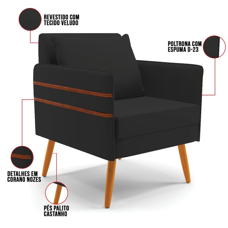 Que tal a Poltrona Mari? Imagine-se utilizando esse produto e usufruindo de todos os benefícios que ela oferece. Usar essa poltrona é bem simples! Pode ser utilizada para evidenciar e enriquecer o seu ambiente, descansar depois de um dia longo de trabalho, ver aquela série favorita ou simplesmente ler seu livro predileto. Sua estrutura é confeccionada em madeira de eucalipto proveniente de reflorestamento, suportando em média até 120 Kg, possuí seus pés palito em madeira, garantindo uma maior resistência e durabilidade ao produto, o estofamento do assento e encosto é composto de espuma D-23, revestido em tecido Veludo no tom Preto. Então, se a sua dificuldade é a otimização de espaço, a poltrona além de confortável e sofisticada, traz toda a funcionalidade que você precisa. Apenas algumas unidades estão disponíveis! Garanta a sua Poltrona Mari antes que acabem agora mesmo! Dimensões da Poltrona: Altura total: 82 cm Largura total: 63 cm Profundidade total: 74 cm Altura do encosto: 51 cm Largura do assento: 54 cm Profundidade do assento: 57 cm Altura do chão ao assento: 47 cm Espessura do assento: 22 cm Altura do chão ao braço: 46 cm Altura interna do braço: 19 cm Tamanho dos pés: 25 cm Espessura do braço: 4 cm Peso: 15 kg Dimensões da Almofada: Altura total: 34 cm Largura total: 51 cm Profundidade total: 20 cm Peso: 0,3 kg Especificações do Produto Estrutura: Madeira Eucalipto Espuma: D-23 Tecido: Veludo Tipo de pés: Pés Palito Castanho Peso suportado: Até 120 Kg Garantia: 90 dias contra defeito de fabricação Montagem: O produto vai montado, apenas rosquear os pés Instruções de limpeza: Utilizar um pano limpo e levemente úmido Você irá receber: 01 Volume com 01 Poltrona Observações Relevantes - Todos os produtos vão embalados com total segurança; - As cores dos produtos podem sofrer alterações dependendo do seu monitor; - Para futuras compras, não garantimos a mesma tonalidade de cor, pois existe variação a cada lote do fabricante do tecido; - As imagens são meramente ilustrativas, não acompanham objetos de decoração e eletros; - Confira as dimensões do produto no momento da compra e certifique-se de que passará normalmente por escadas, elevadores, portas e corredores; - Importante: Por se tratar de estofado as medidas podem ter uma pequena variação em até 3 cm; - Não nos responsabilizamos no ato da entrega por montagens, desmontagens, instalações de produtos; - Não nos responsabilizamos no ato da entrega por subir escadas, elevadores, nem utilização de guinchos ou equipamentos similares para acesso a pisos superiores em apartamentos; - A entrega do produto é realizada em todo território nacional, até onde as rodovias alcançam, entregas fluviais ou aéreas devem ser cotadas a parte; - Observando as orientações acima, evita-se futuros desagrados ou imprevistos com a entrega do produto. Havendo despesas adicionais, serão de responsabilidade do cliente;