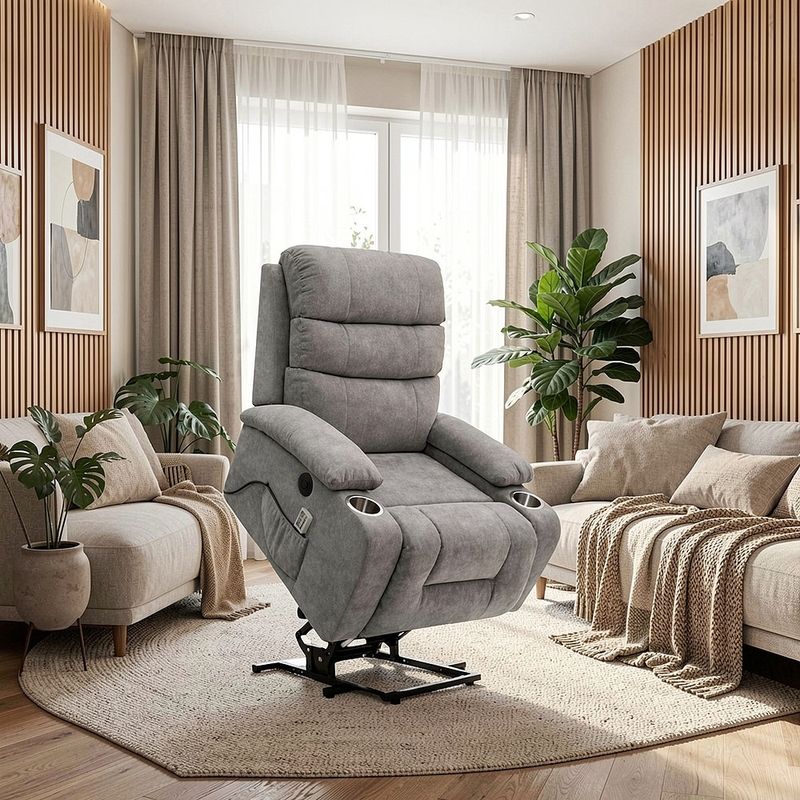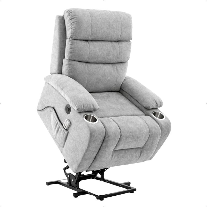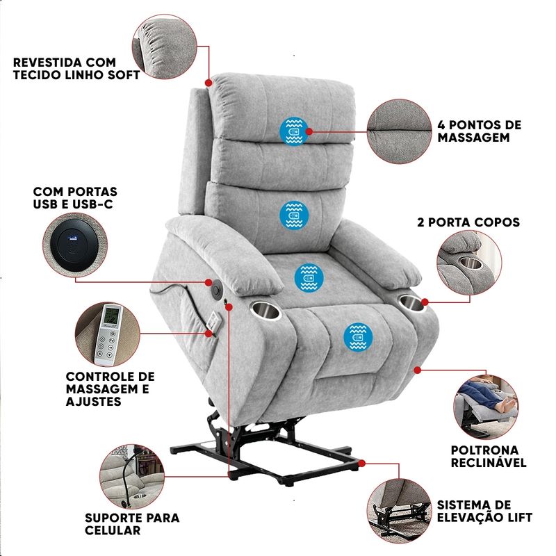 A Poltrona do Papai Reclinável Aurora foi desenvolvida para oferecer conforto, tecnologia e praticidade no dia a dia. Com design elegante e estrutura resistente, ela é ideal para compor salas de estar, quartos ou espaços de descanso, trazendo mais bem-estar para diferentes momentos da rotina. Seu sistema de acionamento elétrico permite ajustar a inclinação de forma suave e prática, transformando o momento de descanso em uma experiência ainda mais confortável. Por isso, é uma excelente opção para quem busca uma Poltrona Reclinável funcional e moderna. Além disso, conta com a função de elevação (lift), que auxilia no movimento de sentar e levantar, oferecendo mais autonomia e segurança ao usuário. Esse recurso também é especialmente útil para pessoas idosas ou com mobilidade reduzida, ajudando a levantar com mais facilidade e conforto no dia a dia. Pensada para proporcionar momentos de relaxamento, a Poltrona com massagem possui sistema integrado que ajuda a aliviar o cansaço do dia a dia. O apoio de pés acompanha o movimento do reclínio, proporcionando melhor acomodação do corpo e tornando o descanso ainda mais agradável. O estofamento em espuma de alta densidade garante conforto prolongado, enquanto o revestimento em linho soft oferece toque macio e aparência sofisticada, combinando facilmente com diversos estilos de decoração. Perfeita para assistir filmes, séries ou simplesmente relaxar, a Poltrona Aurora também pode ser utilizada como Poltrona Cinema ou até mesmo como a tradicional Poltrona do Papai, trazendo conforto e funcionalidade em um único produto. Dimensões do Produto: Altura Total: 102 cm Largura Total: 82 cm Profundidade Total: 94 cm Altura do Encosto: 106 cm Largura do Assento: 50 cm Profundidade do Assento: 54 cm Altura do chão ao Assento: 45 cm Altura do chão ao braço: 57 cm Espessura do braço: 16 cm Peso: 37 kg Especificações do Produto: Estrutura: Em Aço Carbono Material do Estofamento: Espuma em alta Densidade Revestimento: Linho Soft Peso Máximo Suportado: 120 kg Material/Acabamento dos Pés: Aço Carbono Inclui Almofada Extra: Não Tipo de Encosto: Reclinável Tipo de Assento: Reclinável Com Apoio de Pés: Sim Com Altura Ajustável: Sim Diferenciais: Acionamento elétrico com função lift, sistema de massagem integrado e tecido soft que garante máximo conforto no uso diário. Garantia: 90 dias contra defeito de fabricação Instruções de Limpeza: Utilizar um pano limpo e levemente úmido Quantidade de Volumes: 1 Medida das Embalagens: Caixa 1: 75cm x 75cm x 65 cm Peso das Embalagens: 38 Entrega: É feita somente até o térreo ou portaria. Confira sempre as medidas das embalagens para assegurar que o produto passe por portas e escadas do local.
