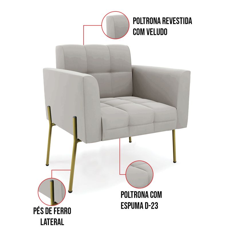Você gosta de colecionar vários momentos memoráveis com sua família e amigos? Que tal recebê-los, com móveis de altíssima qualidade que só a D'Rossi tem? A Poltrona Elisa é adequada para você! Seu design retrô é a grande tendência do momento. Pode ser usada em diversos espaços da casa, em salas, hall de entrada, quartos, cozinhas, varanda, sacada, escritório, dentre outros. Contém as seguintes características: A estrutura é feita Madeira de Eucalipto 100% de reflorestamento, Pés de Ferro Dourado que além de ser resistente e durável, suporta em média até 120 kg. Assento, encosto e braços, contém enchimento de espuma D-23 e é estofada em tecido Veludo, que oferece muito conforto e resistência ao sentar, com aquela sensação de maciez e aconchego. Possui também, detalhes de costura no encosto e assento, resultando em um acabamento impecável, conferindo muito mais valor e elegância ao seu espaço. Para complementar a decoração com essa linda poltrona, a dica é utilizar mantas, almofadas ou vasinho de flor. E pronto, seu cantinho estará perfeito para descansar e relaxar! Aqui, você encontra várias opções, para que seus amigos e familiares se sintam acolhidos. Garanta já sua Poltrona. Dimensões da Poltrona: Altura total: 81 cm Largura total: 76 cm Profundidade total: 64 cm Altura do encosto: 36 cm Largura do assento: 47 cm Profundidade do assento: 48 cm Altura do chão ao assento: 45 cm Espessura do assento: 18 cm Tamanho dos pés: 30 cm Espessura do braço: 9 cm Peso: 18 kg Especificações do Produto Estrutura: Madeira Eucalipto Espuma: D-23 Tecido: Veludo Tipo de pés: Pé de Ferro Dourado Peso suportado: Até 120 Kg Garantia: 90 dias contra defeito de fabricação Montagem: O produto vai montado, apenas parafusar a base Instruções de limpeza: Utilizar um pano limpo e levemente úmido Você irá receber: 01 Poltrona - Entregue em: 01 Volume Observações Relevantes - Todos os produtos vão embalados com total segurança; - As cores dos produtos podem sofrer alterações dependendo do seu monitor; - Para futuras compras, não garantimos a mesma tonalidade de cor, pois existe variação a cada lote do fabricante do tecido; - As imagens são meramente ilustrativas, não acompanham objetos de decoração e eletros; - Confira as dimensões do produto no momento da compra e certifique-se de que passará normalmente por escadas, elevadores, portas e corredores; - Importante: Por se tratar de estofado as medidas podem ter uma pequena variação em até 3 cm; - Não nos responsabilizamos no ato da entrega por montagens, desmontagens, instalações de produtos; - Não nos responsabilizamos no ato da entrega por subir escadas, elevadores, nem utilização de guinchos ou equipamentos similares para acesso a pisos superiores em apartamentos; - A entrega do produto é realizada em todo território nacional, até onde as rodovias alcançam, entregas fluviais ou aéreas devem ser cotadas a parte; - Observando as orientações acima, evita-se futuros desagrados ou imprevistos com a entrega do produto. Havendo despesas adicionais, serão de responsabilidade do cliente;