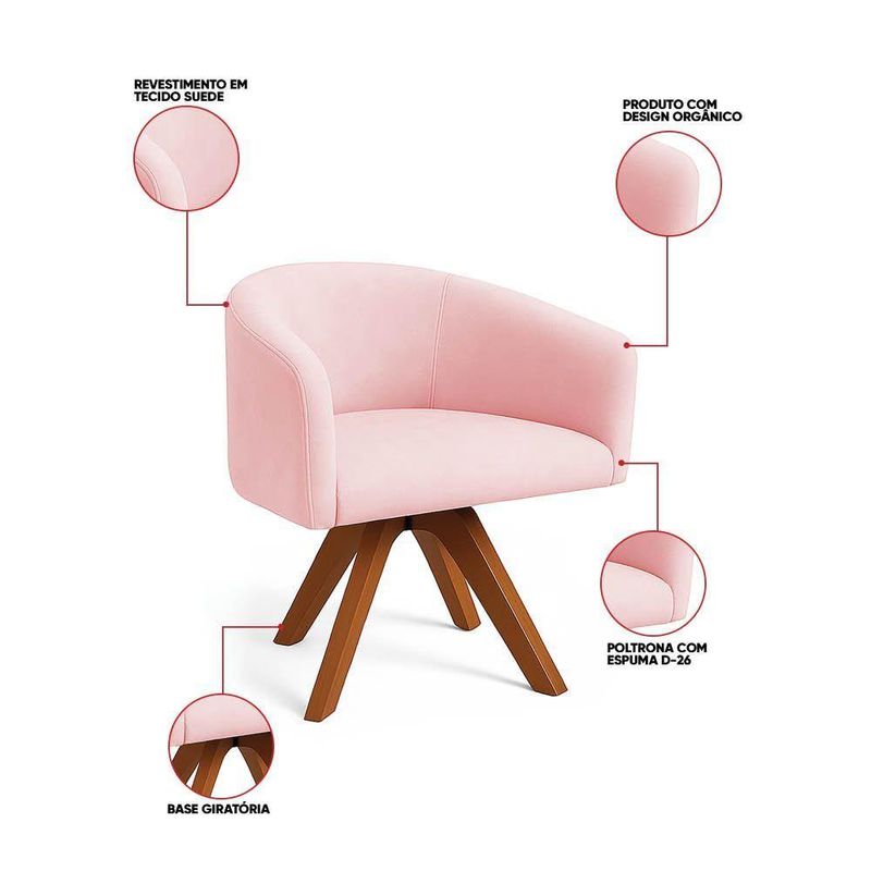 Poltrona Sala Base Giratória Madeira Arielle Suede D03 - D'rossi Cor Rosa BebêA Poltrona Giratória Arielle Suede combina design contemporâneo e conforto absoluto em uma peça que transforma qualquer ambiente. Suas curvas orgânicas no encosto e nos braços criam um visual moderno e acolhedor, perfeito para quem busca sofisticação sem abrir mão da praticidade. O revestimento adiciona um toque aconchegante e macio ao sentar, enquanto a base giratória de madeira MM35 garante movimento prático e versatilidade no dia a dia. A estrutura em madeira de eucalipto e o assento com espuma de alta densidade D-26 oferecem firmeza, resistência e durabilidade, suportando até 120 kg com total segurança. Com proporções bem pensadas, a Arielle é indicada para salas de estar modernas, escritórios criativos, consultórios aconchegantes ou até mesmo aquele cantinho de leitura especial, onde a combinação de design e bem-estar faz toda a diferença. Uma peça versátil que valoriza a decoração e convida você a relaxar em grande estilo. Dimensões do Produto: Altura Total: 75 cm Largura Total: 62 cm Profundidade Total: 58 cm Altura do Encosto: 30 cm Largura do Assento: 49 cm Profundidade do Assento: 50 cm Altura do chão ao Assento: 45 cm Espessura do Assento: 10 cm Altura interna do braço: 15 cm Espessura do braço: 6 cm Peso: 17 kg Especificações do Produto: Estrutura: Madeira de Eucalipto Material do Estofamento: Espuma D-26 (alta densidade) Revestimento: SuedePeso Máximo Suportado: Até 120 Kg Tipo de Pés: Base Giratória de Madeira MM35 Inclui Almofada Extra: Não Tipo de Encosto: Fixo Tipo de Assento: Fixo Com Apoio de Pés: Não Com Altura Ajustável: Não É Reclinável: Não É Giratória: Sim Diferenciais: Design orgânico moderno com linhas curvas. Complexidade da Montagem: Baixa Montagem: O produto vai montado, apenas parafusar a base Garantia: 90 dias contra defeito de fabricação Instruções de Limpeza: Utilizar um pano limpo e levemente úmido Quantidade de Volumes: 1 Caixa Medida das Embalagens: Caixa 1: 69x65x61cm Peso Total das Embalagens: 18 kg Entrega: É feita somente até o térreo ou portaria. Confira sempre as medidas das embalagens para assegurar que o produto passe por portas e escadas do local.
