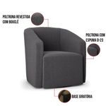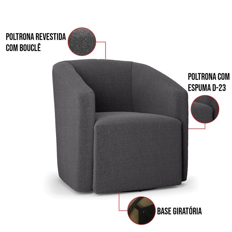 Olha só essa novidade, nossa linda Poltrona Stella Max Giratória! Um estofado que possui um design único, sofisticado e moderno, perfeito para relaxar, ler aquele bom livro ou ver sua série favorita. A Poltrona Stella Max Giratória é fabricada sob alto padrão de qualidade, para atender sua expectativa e necessidade. Seu aspecto arredondado e anatômico, possibilita que a postura fique sempre alinhada, mantendo a coluna na posição correta. Ela dispõe de um acabamento impecável, revestida em Bouclê em tom Grafite, um tecido fácil de limpar, super macio e muito resistente ao desgaste. Com uma estrutura robusta, sua sustentação é dada pela base giratória em metal, com formato de disco, não aparente que fica embutida. Já o enchimento é feito em espuma D-23 no encosto e assento, garantindo maior conforto e segurança ao usuário. É contemporânea e indicada para qualquer ambiente, sendo uma ótima sugestão para usá-la em área comercial, como consultórios, recepção, escritório, sala de espera, dentre outros. Ou em ambientes residenciais como quartos, sala de estar, deixando o local com uma aparência mais moderna e elegante. Gostou de conhecer sobre ela? Então não perca essa chance e adquira já a sua! Dimensões da Poltrona: Altura total: 82 cm Largura total: 70 cm Profundidade total: 65 cm Altura do encosto: 40 cm Largura do assento: 52 cm Profundidade do assento: 48 cm Altura do chão ao assento: 45 cm Espessura do braço: 7 cm Peso: 30 kg Especificações do Produto: Estrutura: Madeira Eucalipto Espuma: D-23 Tecido: Bouclê Tipo de pés: Base Giratória Peso suportado: Até 120 Kg Garantia: 90 dias contra defeito de fabricação Montagem: O produto vai montado, apenas parafusar a base Instruções de limpeza: Utilizar um pano limpo e levemente úmido Você irá receber: 01 Poltrona - Entregue em: 01 Volume Observações Relevantes - Todos os produtos vão embalados com total segurança; - As cores dos produtos podem sofrer alterações dependendo do seu monitor; - Para futuras compras, não garantimos a mesma tonalidade de cor, pois existe variação a cada lote do fabricante do tecido; - As imagens são meramente ilustrativas, não acompanham objetos de deCorição e eletros; - Confira as dimensões do produto no momento da compra e certifique-se de que passará normalmente por escadas, elevadores, portas e corredores; - Importante: Por se tratar de estofado as medidas podem ter uma pequena variação em até 3 cm; - Não nos responsabilizamos no ato da entrega por montagens, desmontagens, instalações de produtos; - Não nos responsabilizamos no ato da entrega por subir escadas, elevadores, nem utilização de guinchos ou equipamentos similares para acesso a pisos superiores em apartamentos; - A entrega do produto é realizada em todo território nacional, até onde as rodovias alcançam, entregas fluviais ou aéreas devem ser cotadas a parte; - Observando as orientações acima, evita-se futuros desagrados ou imprevistos com a entrega do produto. Havendo despesas adicionais, serão de responsabilidade do cliente;