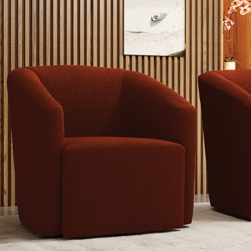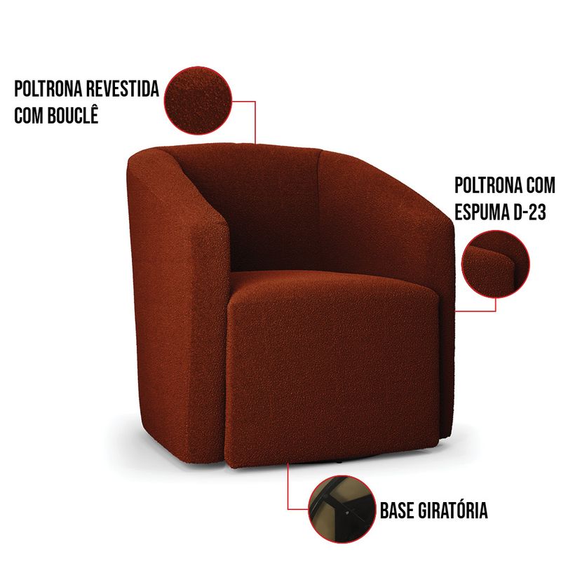 Olha só essa novidade, nossa linda Poltrona Stella Max Giratória! Um estofado que possui um design único, sofisticado e moderno, perfeito para relaxar, ler aquele bom livro ou ver sua série favorita. A Poltrona Stella Max Giratória é fabricada sob alto padrão de qualidade, para atender sua expectativa e necessidade. Seu aspecto arredondado e anatômico, possibilita que a postura fique sempre alinhada, mantendo a coluna na posição correta. Ela dispõe de um acabamento impecável, revestida em Bouclê em tom Terracota, um tecido fácil de limpar, super macio e muito resistente ao desgaste. Com uma estrutura robusta, sua sustentação é dada pela base giratória em metal, com formato de disco, não aparente que fica embutida. Já o enchimento é feito em espuma D-23 no encosto e assento, garantindo maior conforto e segurança ao usuário. É contemporânea e indicada para qualquer ambiente, sendo uma ótima sugestão para usá-la em área comercial, como consultórios, recepção, escritório, sala de espera, dentre outros. Ou em ambientes residenciais como quartos, sala de estar, deixando o local com uma aparência mais moderna e elegante. Gostou de conhecer sobre ela? Então não perca essa chance e adquira já a sua! Dimensões da Poltrona: Altura total: 82 cm Largura total: 70 cm Profundidade total: 65 cm Altura do encosto: 40 cm Largura do assento: 52 cm Profundidade do assento: 48 cm Altura do chão ao assento: 45 cm Espessura do braço: 7 cm Peso: 30 kg Especificações do Produto: Estrutura: Madeira Eucalipto Espuma: D-23 Tecido: Bouclê Tipo de pés: Base Giratória Peso suportado: Até 120 Kg Garantia: 90 dias contra defeito de fabricação Montagem: O produto vai montado, apenas parafusar a base Instruções de limpeza: Utilizar um pano limpo e levemente úmido Você irá receber: 01 Poltrona - Entregue em: 01 Volume Observações Relevantes - Todos os produtos vão embalados com total segurança; - As cores dos produtos podem sofrer alterações dependendo do seu monitor; - Para futuras compras, não garantimos a mesma tonalidade de cor, pois existe variação a cada lote do fabricante do tecido; - As imagens são meramente ilustrativas, não acompanham objetos de deCorição e eletros; - Confira as dimensões do produto no momento da compra e certifique-se de que passará normalmente por escadas, elevadores, portas e corredores; - Importante: Por se tratar de estofado as medidas podem ter uma pequena variação em até 3 cm; - Não nos responsabilizamos no ato da entrega por montagens, desmontagens, instalações de produtos; - Não nos responsabilizamos no ato da entrega por subir escadas, elevadores, nem utilização de guinchos ou equipamentos similares para acesso a pisos superiores em apartamentos; - A entrega do produto é realizada em todo território nacional, até onde as rodovias alcançam, entregas fluviais ou aéreas devem ser cotadas a parte; - Observando as orientações acima, evita-se futuros desagrados ou imprevistos com a entrega do produto. Havendo despesas adicionais, serão de responsabilidade do cliente;