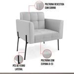A Poltrona Elisa revestida em Sintético Cinza é adequada para quem busca um ambiente refinado e funcional. Seu design destaca a estrutura em madeira de eucalipto, reconhecida pela resistência e durabilidade, aliada à espuma D-26 que garante aconchego equilibrado no uso diário. O revestimento é realçado pela costura em formato quadriculado e pelo detalhe em matelassê, que conferem acabamento refinado. Os pés de aço preto traz um contraste contemporâneo, valorizando o visual do conjunto e oferecendo excelente estabilidade. Com encosto e assento fixos, a Elisa proporciona sustentação firme e ergonomia perfeita para longas conversas à mesa. Suporta até 120 kg, sendo ideal para uso residencial ou corporativo. Cada detalhe foi pensado para combinar charme e funcionalidade em um único móvel. Dimensões do Produto: Altura Total: 81 cm Largura Total: 76 cm Profundidade Total: 64 cm Altura do Encosto: 36 cm Largura do Assento: 47 cm Profundidade do Assento: 48 cm Altura do chão ao Assento: 45 cm Espessura do Assento: 18 cm Altura total dos pés: 27 cm Altura do chão ao braço: 65 cm Altura interna do braço: 20 cm Espessura do braço: 9 cm Peso: 18 kg Especificações do Produto: Estrutura: Madeira de Eucalipto Material do Estofamento: Assento Espuma D-26 (alta densidade) Braço e encosto D-23 Revestimento: SintéticoPeso Máximo Suportado: Até 120 Kg Tipo de Pés: Pé de Aço PretoMaterial/Acabamento dos Pés: Aço Carbono com Pintura eletrostática Inclui Almofada Extra: Não Tipo de Encosto: Fixo Tipo de Assento: Fixo Com Apoio de Pés: Não Com Altura Ajustável: Não É Reclinável: Não É Giratória: Não Diferenciais: Design moderno; Costura em formato quadriculado no encosto e assento; Detalhe na costura em Matelassê. Complexidade da Montagem: Baixa Montagem: O produto vai montado, apenas parafusar os pés Garantia: 90 dias contra defeito de fabricação Instruções de Limpeza: Utilizar um pano limpo e levemente úmido Quantidade de Volumes: 1 Caixa Medida das Embalagens: Caixa 1: 72 cm x 66 cm x 58 cm Peso das Embalagens: 20 kg Entrega: É feita somente até o térreo ou portaria. Confira sempre as medidas das embalagens para assegurar que o produto passe por portas e escadas do local.