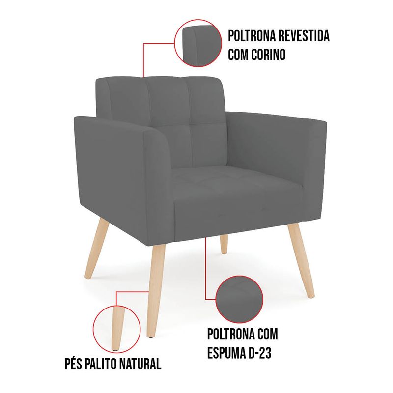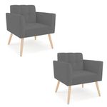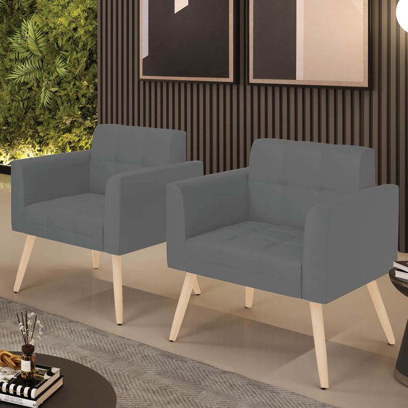 O Kit 2 Poltronas Elisa revestida em Sintético Grafite é adequada para quem busca um ambiente refinado e funcional. Seu design destaca a estrutura em madeira de eucalipto, reconhecida pela resistência e durabilidade, aliada à espuma D-26 que garante aconchego equilibrado no uso diário. O revestimento é realçado pela costura em formato quadriculado e pelo detalhe em matelassê, que conferem acabamento refinado. Os pés palito natural traz um contraste contemporâneo, valorizando o visual do conjunto e oferecendo excelente estabilidade. Com encosto e assento fixos, a Elisa proporciona sustentação firme e ergonomia perfeita para longas conversas à mesa. Suporta até 120 kg, sendo ideal para uso residencial ou corporativo. Cada detalhe foi pensado para combinar charme e funcionalidade em um único móvel. Dimensões do Produto: Altura Total: 81 cm Largura Total: 64 cm Profundidade Total: 64 cm Altura do Encosto: 36 cm Largura do Assento: 47 cm Profundidade do Assento: 48 cm Altura do chão ao Assento: 48 cm Espessura do Assento: 18 cm Altura total dos pés: 27 cm Altura do chão ao braço: 67 cm Altura interna do braço: 20 cm Espessura do braço: 9 cm Peso: 14 kg Especificações do Produto: Estrutura: Madeira de Eucalipto Material do Estofamento: Assento Espuma D-26 (alta densidade) Braço e encosto D-23 Revestimento: SintéticoPeso Máximo Suportado: Até 120 Kg Tipo de Pés: Pé Palito Natural Material/Acabamento dos Pés: Madeira (envernizada) Inclui Almofada Extra: Não Tipo de Encosto: Fixo Tipo de Assento: Fixo, percintas elásticas Com Apoio de Pés: Não Com Altura Ajustável: Não É Reclinável: Não É Giratória: Não Diferenciais: Design moderno; Costura em formato quadriculado no encosto e assento; Detalhe na costura em Matelassê. Complexidade da Montagem: Baixa Montagem: O produto vai montado, apenas rosquear os pés na poltrona. Garantia: 90 dias contra defeito de fabricação Instruções de Limpeza: Utilizar um pano limpo e levemente úmido Quantidade de Volumes: 1 Caixa Medida das Embalagens: Caixa 1: 83 cm x 80 cm x 67 cm Peso das Embalagens: 32 kg Entrega: É feita somente até o térreo ou portaria. Confira sempre as medidas das embalagens para assegurar que o produto passe por portas e escadas do local.