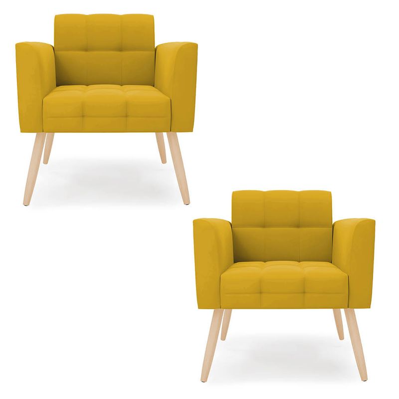 O Kit 2 Poltronas Elisa revestida em Veludo Mostarda é adequada para quem busca um ambiente refinado e funcional. Seu design destaca a estrutura em madeira de eucalipto, reconhecida pela resistência e durabilidade, aliada à espuma D-26 que garante aconchego equilibrado no uso diário. O revestimento é realçado pela costura em formato quadriculado e pelo detalhe em matelassê, que conferem acabamento refinado. Os pés palito natural traz um contraste contemporâneo, valorizando o visual do conjunto e oferecendo excelente estabilidade. Com encosto e assento fixos, a Elisa proporciona sustentação firme e ergonomia perfeita para longas conversas à mesa. Suporta até 120 kg, sendo ideal para uso residencial ou corporativo. Cada detalhe foi pensado para combinar charme e funcionalidade em um único móvel. Dimensões do Produto: Altura Total: 81 cm Largura Total: 64 cm Profundidade Total: 64 cm Altura do Encosto: 36 cm Largura do Assento: 47 cm Profundidade do Assento: 48 cm Altura do chão ao Assento: 48 cm Espessura do Assento: 18 cm Altura total dos pés: 27 cm Altura do chão ao braço: 67 cm Altura interna do braço: 20 cm Espessura do braço: 9 cm Peso: 14 kg Especificações do Produto: Estrutura: Madeira de Eucalipto Material do Estofamento: Assento Espuma D-26 (alta densidade) Braço e encosto D-23 Revestimento: VeludoPeso Máximo Suportado: Até 120 Kg Tipo de Pés: Pé Palito Natural Material/Acabamento dos Pés: Madeira (envernizada) Inclui Almofada Extra: Não Tipo de Encosto: Fixo Tipo de Assento: Fixo, percintas elásticas Com Apoio de Pés: Não Com Altura Ajustável: Não É Reclinável: Não É Giratória: Não Diferenciais: Design moderno; Costura em formato quadriculado no encosto e assento; Detalhe na costura em Matelassê. Complexidade da Montagem: Baixa Montagem: O produto vai montado, apenas rosquear os pés na poltrona. Garantia: 90 dias contra defeito de fabricação Instruções de Limpeza: Utilizar um pano limpo e levemente úmido Quantidade de Volumes: 1 Caixa Medida das Embalagens: Caixa 1: 83 cm x 80 cm x 67 cm Peso das Embalagens: 32 kg Entrega: É feita somente até o térreo ou portaria. Confira sempre as medidas das embalagens para assegurar que o produto passe por portas e escadas do local.