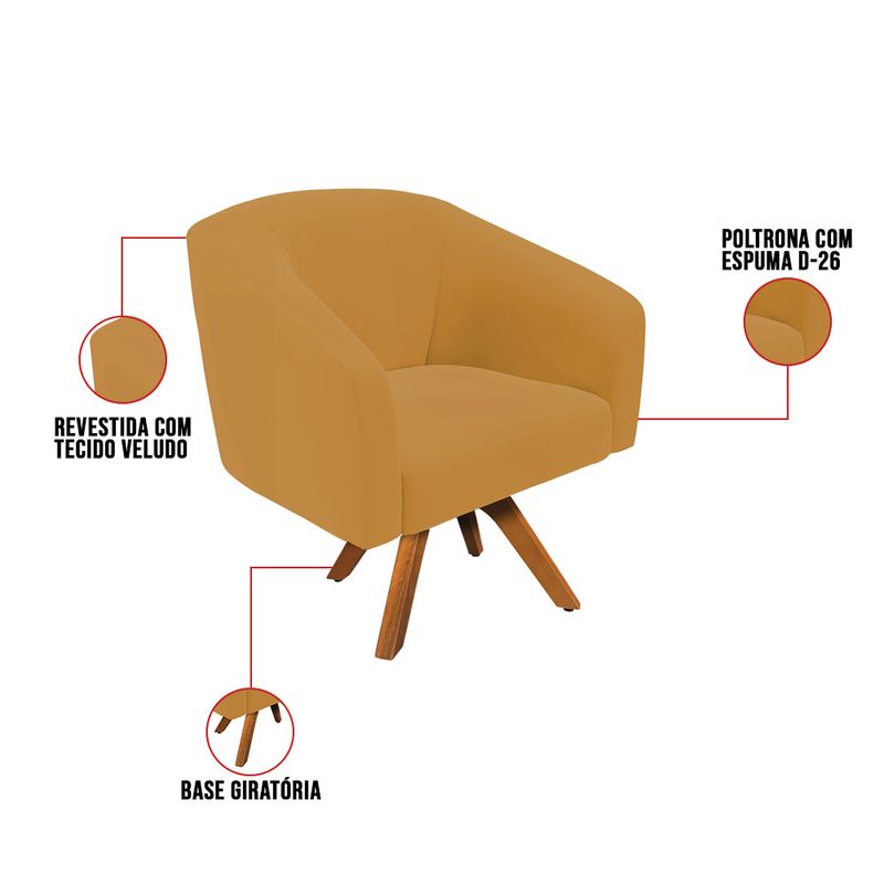 A Poltrona Stella revestida em Veludo Mostarda e é adequada para quem busca um ambiente refinado e funcional. Seu design destaca a estrutura em madeira de eucalipto, reconhecida pela resistência e durabilidade, aliada à espuma D-26 que garante aconchego equilibrado no uso diário. O revestimento adiciona textura suave e toque aconchegante, criando uma atmosfera sofisticada e convidativa. A base giratória de madeira realça o estilo do produto e oferece liberdade de movimento, garantindo praticidade no dia a dia. Com encosto e assento fixos, a Stella proporciona sustentação firme e ergonomia perfeita para longas conversas à mesa. Suporta até 120 kg, sendo ideal para uso residencial ou corporativo. Cada detalhe foi pensado para combinar charme e funcionalidade em um único móvel. Dimensões do Produto: Altura Total: 81 cm Largura Total: 69 cm Profundidade Total: 60 cm Altura do Encosto: 40 cm Largura do Assento: 45 cm Profundidade do Assento: 45 cm Altura do chão ao Assento: 45 cm Espessura do Assento: 15 cm Espessura do braço: 7 cm Altura do chão ao braço: 70 cm Tamanho dos pés: 30 cm Altura interna do braço: 28 cm Peso: 20 kg Especificações do Produto: Estrutura: Madeira de Eucalipto Material do Estofamento: Assento Espuma D-26 (alta densidade) Braço e encosto D-23 Revestimento: VeludoPeso Máximo Suportado: Até 120 Kg Tipo de Pés: Base Giratória MM30 Material/Acabamento dos Pés: Madeira de Eucalipto Inclui Almofada Extra: Não Tipo de Encosto: Fixo Tipo de Assento: Fixo, percintas elásticas Com Apoio de Pés: Não Com Altura Ajustável: Não É Reclinável: Não É Giratória: Sim Diferenciais: Design sofisticado e aconchegante; Combinação perfeita em qualquer ambiente; Estrutura reforçada em madeira de eucalipto. Complexidade da Montagem: Baixa Montagem: O produto vai montado, apenas parafusar a base Garantia: 90 dias contra defeito de fabricação Instruções de Limpeza: Utilizar um pano limpo e levemente úmido Quantidade de Volumes: 1 Caixa Medida das Embalagens: Caixa 1: 72 cm x 66 cm x 58 cm Peso das Embalagens: 22 kg Entrega: É feita somente até o térreo ou portaria. Confira sempre as medidas das embalagens para assegurar que o produto passe por portas e escadas do local.