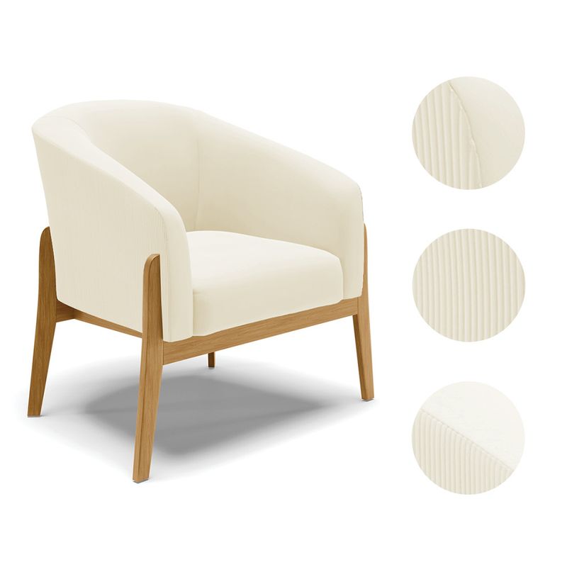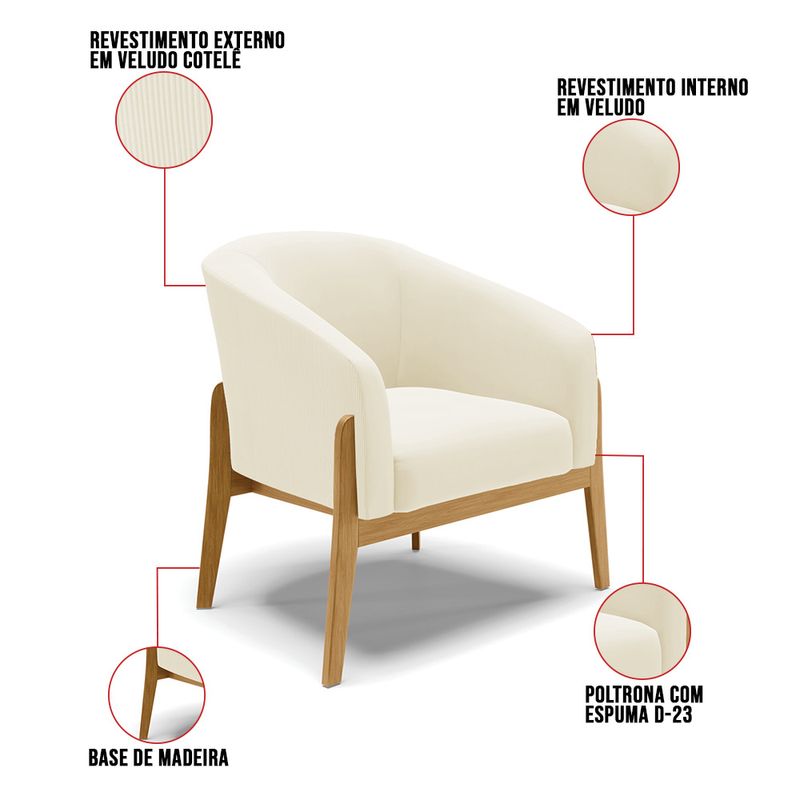 A Poltrona Stella em Veludo Cotelê Bege une elegância moderna e conforto acolhedor, ideal para quem busca um ambiente refinado e funcional. Seu design destaca a estrutura em madeira de eucalipto, reconhecida pela resistência e durabilidade, aliada à espuma D-26 que garante conforto equilibrado no uso diário. O revestimento adiciona textura suave e toque aconchegante, criando uma atmosfera sofisticada e convidativa. A base fixa de mandeira castanho traz um contraste contemporâneo, valorizando o visual do conjunto e oferecendo excelente estabilidade. Com encosto e assento fixos, a Stella proporciona sustentação firme e ergonomia perfeita para longas conversas à mesa. Suporta até 120 kg, sendo ideal para uso residencial ou corporativo. Cada detalhe foi pensado para combinar charme, funcionalidade e resistência em um único móvel. Dimensões do Produto: Altura Total: 81 cm Largura Total: 85 cm Profundidade Total: 60 cm Altura do Encosto: 40 cm Largura do Assento: 45 cm Profundidade do Assento: 45 cm Altura do chão ao Assento: 45 cm Espessura do Assento: 15 cm Altura do chão ao braço: 73 cm Espessura do braço: 10 cm Altura interna do braço: 28 cm Peso: 21 kg Especificações do Produto: Estrutura: Madeira de Eucalipto Material do Estofamento: Assento Espuma D-26 (alta densidade) Braço e encosto D-23 Revestimento: Veludo CotelêPeso Máximo Suportado: Até 120 Kg Tipo de Pés: Base de Madeira (fixa) Material/Acabamento dos Pés: Madeira Maciça Inclui Almofada Extra: Não Tipo de Encosto: Fixo Tipo de Assento: Fixo, percintas elásticas Com Apoio de Pés: Não Com Altura Ajustável: Não É Reclinável: Não É Giratória: Não Diferenciais: Design sofisticado e aconchegante; Combinação perfeita em qualquer ambiente; Estrutura reforçada em madeira de eucalipto. Complexidade da Montagem: Baixa Montagem: O produto vai montado, apenas parafusar a base Garantia: 90 dias contra defeito de fabricação Instruções de Limpeza: Utilizar um pano limpo e levemente úmido Quantidade de Volumes: 1 Caixa Medida das Embalagens: Caixa 1: 72 cm x 66 cm x 58 cm Peso das Embalagens: 23 kg Entrega: É feita somente até o térreo ou portaria. Confira sempre as medidas das embalagens para assegurar que o produto passe por portas e escadas do local.