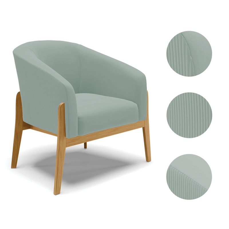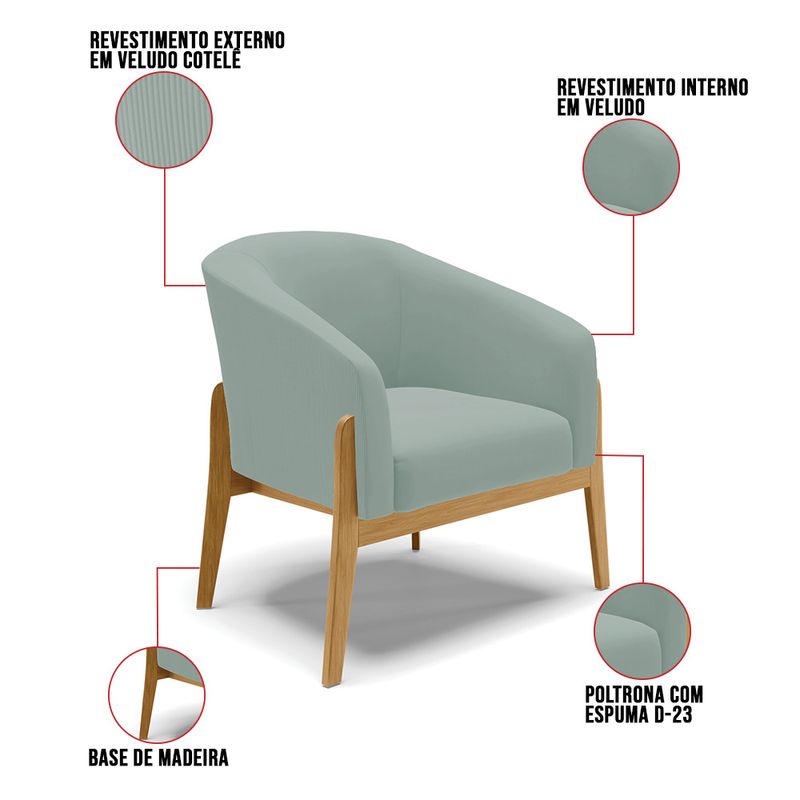 A Poltrona Stella em Veludo Cotelê Menta une elegância moderna e conforto acolhedor, ideal para quem busca um ambiente refinado e funcional. Seu design destaca a estrutura em madeira de eucalipto, reconhecida pela resistência e durabilidade, aliada à espuma D-26 que garante conforto equilibrado no uso diário. O revestimento adiciona textura suave e toque aconchegante, criando uma atmosfera sofisticada e convidativa. A base fixa de mandeira castanho traz um contraste contemporâneo, valorizando o visual do conjunto e oferecendo excelente estabilidade. Com encosto e assento fixos, a Stella proporciona sustentação firme e ergonomia perfeita para longas conversas à mesa. Suporta até 120 kg, sendo ideal para uso residencial ou corporativo. Cada detalhe foi pensado para combinar charme, funcionalidade e resistência em um único móvel. Dimensões do Produto: Altura Total: 81 cm Largura Total: 85 cm Profundidade Total: 60 cm Altura do Encosto: 40 cm Largura do Assento: 45 cm Profundidade do Assento: 45 cm Altura do chão ao Assento: 45 cm Espessura do Assento: 15 cm Altura do chão ao braço: 73 cm Espessura do braço: 10 cm Altura interna do braço: 28 cm Peso: 21 kg Especificações do Produto: Estrutura: Madeira de Eucalipto Material do Estofamento: Assento Espuma D-26 (alta densidade) Braço e encosto D-23 Revestimento: Veludo CotelêPeso Máximo Suportado: Até 120 Kg Tipo de Pés: Base de Madeira (fixa) Material/Acabamento dos Pés: Madeira Maciça Inclui Almofada Extra: Não Tipo de Encosto: Fixo Tipo de Assento: Fixo, percintas elásticas Com Apoio de Pés: Não Com Altura Ajustável: Não É Reclinável: Não É Giratória: Não Diferenciais: Design sofisticado e aconchegante; Combinação perfeita em qualquer ambiente; Estrutura reforçada em madeira de eucalipto. Complexidade da Montagem: Baixa Montagem: O produto vai montado, apenas parafusar a base Garantia: 90 dias contra defeito de fabricação Instruções de Limpeza: Utilizar um pano limpo e levemente úmido Quantidade de Volumes: 1 Caixa Medida das Embalagens: Caixa 1: 72 cm x 66 cm x 58 cm Peso das Embalagens: 23 kg Entrega: É feita somente até o térreo ou portaria. Confira sempre as medidas das embalagens para assegurar que o produto passe por portas e escadas do local.