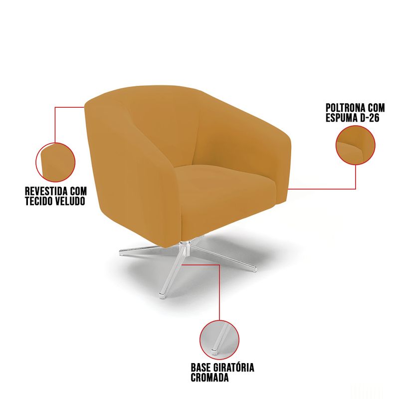 A Poltrona Stella revestida em Veludo Mostarda e é adequada para quem busca um ambiente refinado e funcional. Seu design destaca a estrutura em madeira de eucalipto, reconhecida pela resistência e durabilidade, aliada à espuma D-26 que garante aconchego equilibrado no uso diário. O revestimento adiciona textura suave e toque aconchegante, criando uma atmosfera sofisticada e convidativa. A base giratória cromada realça o estilo do produto e oferece liberdade de movimento, garantindo praticidade no dia a dia. Com encosto e assento fixos, a Stella proporciona sustentação firme e ergonomia perfeita para longas conversas à mesa. Suporta até 120 kg, sendo ideal para uso residencial ou corporativo. Cada detalhe foi pensado para combinar charme e funcionalidade em um único móvel. Dimensões do Produto: Altura Total: 81 cm Largura Total: 69 cm Profundidade Total: 60 cm Altura do Encosto: 40 cm Largura do Assento: 45 cm Profundidade do Assento: 45 cm Altura do chão ao Assento: 45 cm Espessura do Assento: 15 cm Espessura do braço: 7 cm Altura do chão ao braço: 70 cm Tamanho dos pés: 30 cm Altura interna do braço: 28 cm Peso: 20 kg Especificações do Produto: Estrutura: Madeira de Eucalipto Material do Estofamento: Assento Espuma D-26 (alta densidade) Braço e encosto D-23 Revestimento: VeludoPeso Máximo Suportado: Até 120 Kg Tipo de Pés: Base Giratória Cromada Material/Acabamento dos Pés: AçoInclui Almofada Extra: Não Tipo de Encosto: Fixo Tipo de Assento: Fixo, percintas elásticas Com Apoio de Pés: Não Com Altura Ajustável: Não É Reclinável: Não É Giratória: Sim Diferenciais: Design sofisticado e aconchegante; Combinação perfeita em qualquer ambiente; Estrutura reforçada em madeira de eucalipto. Complexidade da Montagem: Baixa Montagem: O produto vai montado, apenas parafusar a base Garantia: 90 dias contra defeito de fabricação Instruções de Limpeza: Utilizar um pano limpo e levemente úmido Quantidade de Volumes: 1 Caixa Medida das Embalagens: Caixa 1: 72 cm x 66 cm x 58 cm Peso das Embalagens: 22 kg Entrega: É feita somente até o térreo ou portaria. Confira sempre as medidas das embalagens para assegurar que o produto passe por portas e escadas do local.