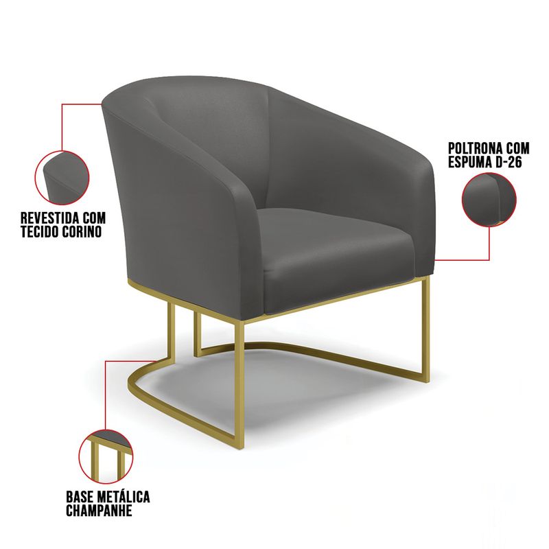 A Poltrona Stella em Sintético Grafite une elegância moderna e conforto acolhedor, ideal para quem busca um ambiente refinado e funcional. Seu design destaca a estrutura em madeira de eucalipto, reconhecida pela resistência e durabilidade, aliada à espuma D-26 que garante conforto equilibrado no uso diário. O revestimento adiciona textura suave e toque aconchegante, criando uma atmosfera sofisticada e convidativa. A base metálica com acabamento dourado traz um contraste contemporâneo, valorizando o visual do conjunto e oferecendo excelente estabilidade. Com encosto e assento fixos, a Stella proporciona sustentação firme e ergonomia perfeita para longas conversas à mesa. Suporta até 120 kg, sendo ideal para uso residencial ou corporativo. Cada detalhe foi pensado para combinar charme, funcionalidade e resistência em um único móvel. Dimensões do Produto: Altura Total: 81 cm Largura Total: 68 cm Profundidade Total: 60 cm Altura do Encosto: 40 cm Largura do Assento: 45 cm Profundidade do Assento: 45 cm Altura do chão ao Assento: 45 cm Espessura do Assento: 15 cm Altura total dos pés: 30 cm Altura do chão ao braço: 73 cm Espessura do braço: 10 cm Altura interna do braço: 28 cm Peso: 21 kg Especificações do Produto: Estrutura: Madeira de Eucalipto Material do Estofamento: Assento Espuma D-26 (alta densidade) Braço e encosto D-23 Revestimento: SintéticoPeso Máximo Suportado: Até 120 Kg Tipo de Pés: Base Industrial DouradaMaterial/Acabamento dos Pés: Aço Carbono com Pintura eletrostática Inclui Almofada Extra: Não Tipo de Encosto: Fixo Tipo de Assento: Fixo, percintas elásticas Com Apoio de Pés: Não Com Altura Ajustável: Não É Reclinável: Não É Giratória: Não Diferenciais: Design sofisticado e aconchegante; Combinação perfeita em qualquer ambiente; Estrutura reforçada em madeira de eucalipto. Complexidade da Montagem: Baixa Montagem: O produto vai montado, apenas parafusar a base Garantia: 90 dias contra defeito de fabricação Instruções de Limpeza: Utilizar um pano limpo e levemente úmido Quantidade de Volumes: 1 Caixa Medida das Embalagens: Caixa 1: 72 cm x 66 cm x 58 cm Peso das Embalagens: 23 kg Entrega: É feita somente até o térreo ou portaria. Confira sempre as medidas das embalagens para assegurar que o produto passe por portas e escadas do local.
