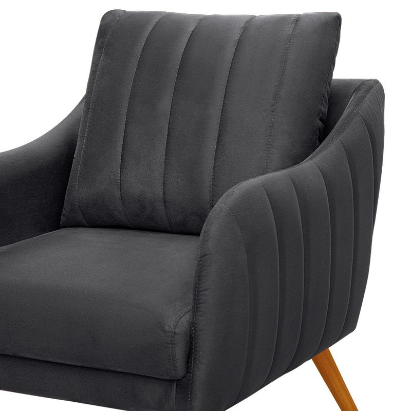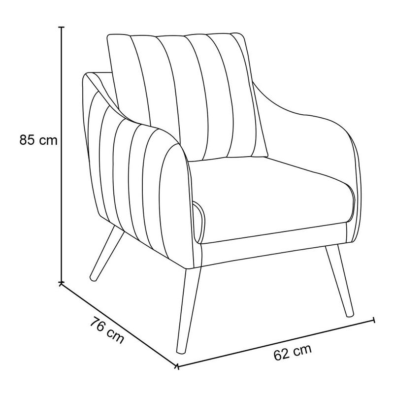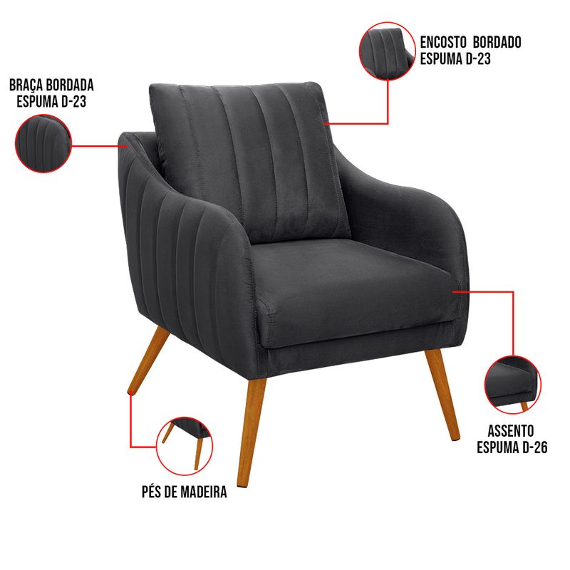 Uma peça clássica e imponente, conta com um design moderno com detalhes na almofada e na costura das laterais dos braços. Portanto, por ter essa característica mais diversificada ela ganha esse destaque maior, impossível de não ser notada. Produzida com materiais de altíssima qualidade, revestida em tecido Veludo no tom Grafite. Confeccionada com madeira de reflorestamento. Afinal a missão da nossa empresa é contribuir com o meio ambiente e levar até você peças maravilhosas sem agredir o planeta, protegendo o futuro. Pés palito castanho que dão o apoio necessário para suportar até 120 Kg. Assento fixo em espuma D-26 e encosto fixo com almofada solta levando mais versatilidade para o dia a dia. Não deixe essa oportunidade passar e adquira já a sua Poltrona Salem!! Dimensões Poltrona: Altura total: 85 cm Largura total: 62 cm Profundidade total: 76 cm Peso: 13 kg Especificações do Produto Estrutura: Madeira Eucalipto Reflorestada, MDF Espuma: D-23 e D-26 Tecido: Suede Tipo de pés: Pés Palito Castanho Peso suportado: Até 120 Kg Garantia: 90 dias contra defeito de fabricação Montagem: O produto vai montado, apenas rosquear os pés Instruções de limpeza: Utilizar um pano limpo e levemente úmido Você irá receber: 01 Volume com 01 Poltrona Observações Relevantes - Todos os produtos vão embalados com total segurança; - As cores dos produtos podem sofrer alterações dependendo do seu monitor; - Para futuras compras, não garantimos a mesma tonalidade de cor, pois existe variação a cada lote do fabricante do tecido; - As imagens são meramente ilustrativas, não acompanham objetos de decoração e eletros; - Confira as dimensões do produto no momento da compra e certifique-se de que passará normalmente por escadas, elevadores, portas e corredores; - Importante: Por se tratar de estofado as medidas podem ter uma pequena variação em até 3 cm; - Não nos responsabilizamos no ato da entrega por montagens, desmontagens, instalações de produtos; - Não nos responsabilizamos no ato da entrega por subir escadas, elevadores, nem utilização de guinchos ou equipamentos similares para acesso a pisos superiores em apartamentos; - A entrega do produto é realizada em todo território nacional, até onde as rodovias alcançam, entregas fluviais ou aéreas devem ser cotadas a parte; - Observando as orientações acima, evita-se futuros desagrados ou imprevistos com a entrega do produto. Havendo despesas adicionais, serão de responsabilidade do cliente;