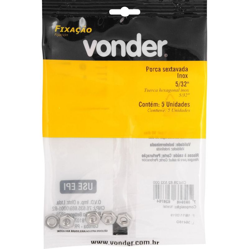 Marca: VonderConteúdo da Embalagem:1 Cartela com 5 porcas sextavadas inoxDestaques e diferenciais:Fabricada em aço inox, proporcionando excelente resistência contra oxidação/corrosão.Aplicações e dicas de uso:Indicada para fixações em conjunto com parafusos sextavados, franceses, hastes ou barras roscadas, com roscas compatíveis.Características Técnicas:Diâmetro da rosca da porca (pol): 5/32" " Tipo da rosca da porca: BSW - Polegada rosca grossa Material da porca: Inox