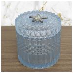 Porta Algodão E Cotonete Azul Vidro 11cm - Design moderno. Acabamento excelente, um detalhe de estrela em metal, lindo. Combina com qualquer ambiente. Medidas Porta Algodão: Altura: 11cm / Diâmetro: 10,5cm Material: * Porta Algodão: Vidro. Contém: 1 peça Características Gerais do Produto: • Material: Cerâmica • Cor: Branco; Vermelho Garantia: • Garantia de fábrica - 1 Mês
