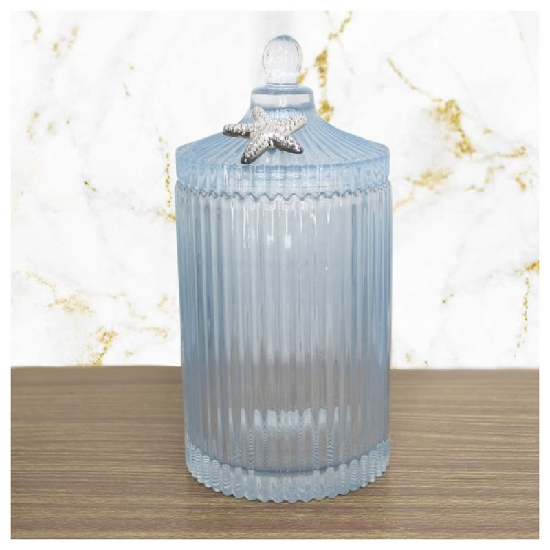 Porta Algodão E Cotonete Azul Vidro 22cm - Design moderno. Acabamento excelente, um detalhe de estrela em metal, lindo. Combina com qualquer ambiente. Medidas Porta Algodão: Altura: 22cm / Diâmetro: 10,5cm Material: * Porta Algodão: Vidro. Contém: 1 peça Características Gerais do Produto: • Material: Cerâmica • Cor: Branco; Vermelho Garantia: • Garantia de fábrica - 1 Mês