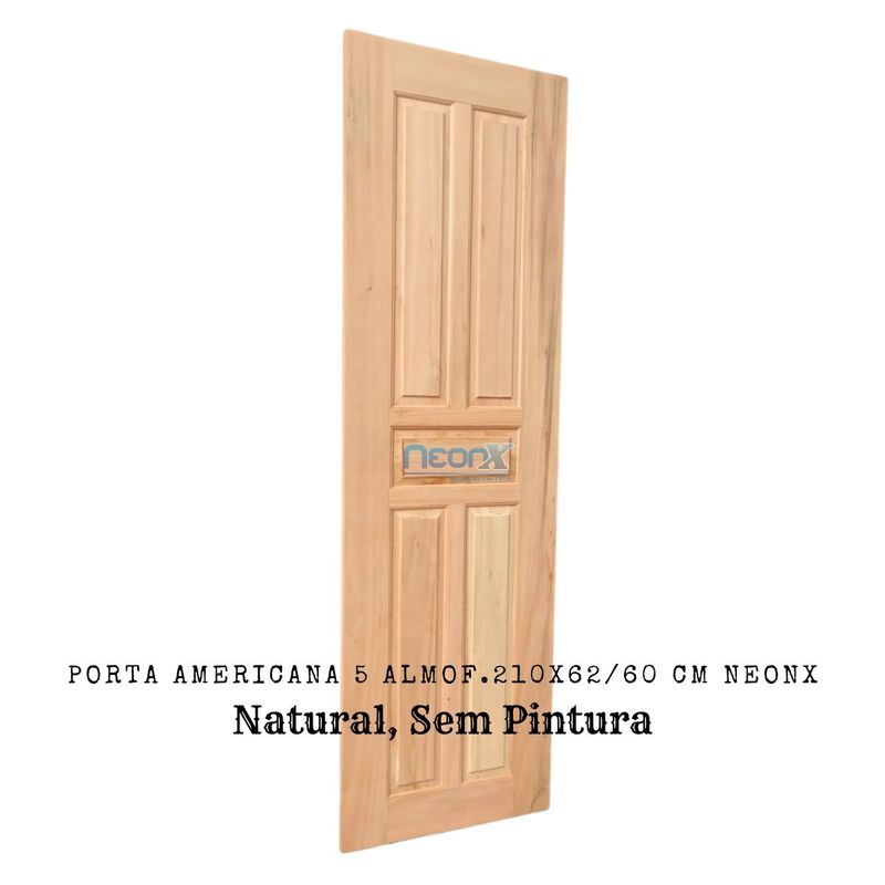 As portas NeonX são fabricadas com a melhor madeira seca disponível, com baixíssima taxa de umidade interna, minimizando os riscos de empeno. A Linha de portas é fabricada em madeira maciça de eucalipto proveniente de florestas renováveis. Oferece resistência e segurança pois tem 3 cm de espessura de madeira maciça, ideal para portas externas, mas podendo ser utilizada também em ambientes internos, trazendo segurança, requinte, classe, estilo e elegância. A tecnologia de prensagem e colagem das portas NeonX, além de trazerem muita resistência ao produto como um todo, minimizam as falhas com empenamento. São bonitas e podem ser utilizadas como portas de abrir, pivotante e também de correr. Características: Modelo: Americana 5 Almofadas Marca: NeonX Altura: 210 cm (2,1 metros) Largura: 62 cm (0,62 metros) Espessura: 3 cm Utilização: Externa ou Interna Tipo de madeira: Eucalipto de florestas renováveis (sem tratamento); Acabamento: Lixado, sem pintura Peso aproximado: 31 kg Pode ser utilizada como articulada (com dobradiças), de correr ou pivotante. Sobre a Marca: A NeonX ® é uma marca registrada. Possui quase 50 anos de mercado e é a maior fabricante de decks modulares em madeira do Brasil. Conta com rígido controle de qualidade e padronização de seus produtos. Pode confiar na NeonX ®. Observações: - O produto pode ser ajustado em alguns cm no momento da instalação pelo instalador / marceneiro / pedreiro; - Não possui orifício para fechadura, devendo ser feito pelo instalador; - Por não possuir orifício para fechadura, poderá ser instalada como direita ou esquerda, articulada, de correr ou pivotante. Verifique com o instalador. - Não nos responsabilizamos pela montagem do produto. - Não acompanham acessórios como ferragens.