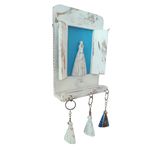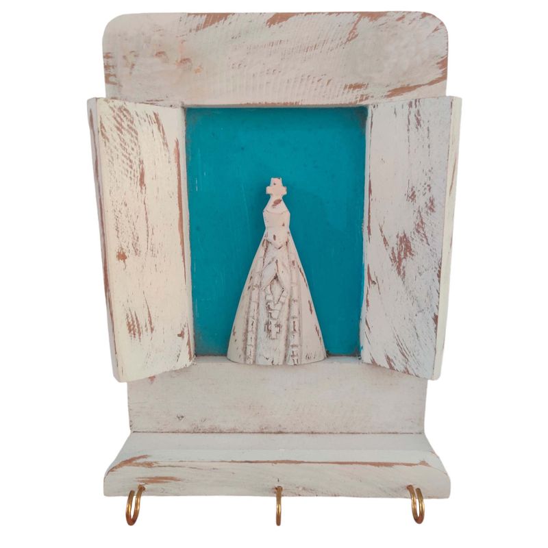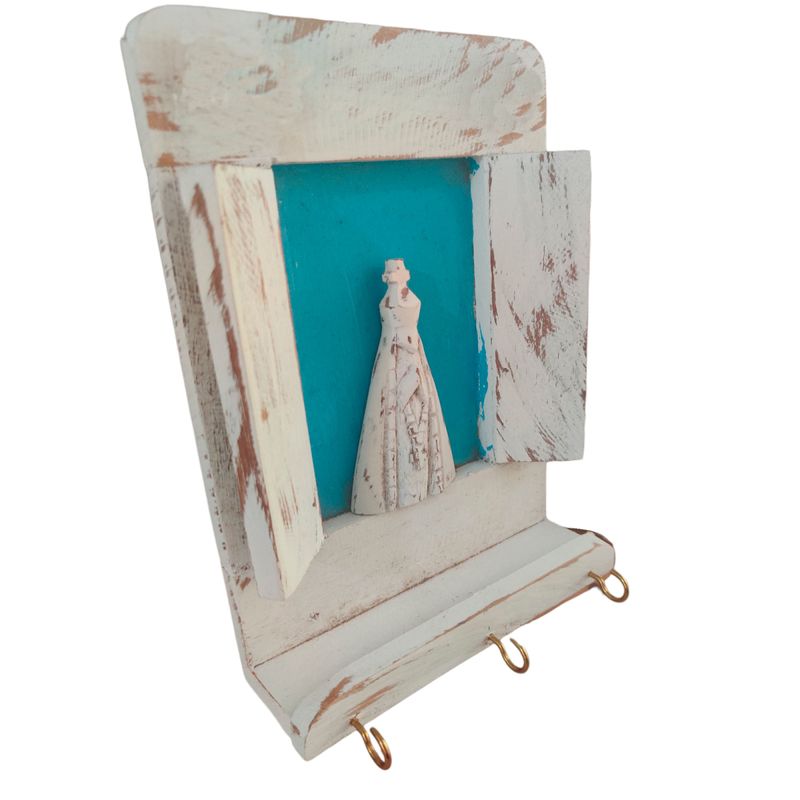 Feito com madeira maciça, este porta-chaves é durável e resistente, garantindo que você desfrute de sua beleza por muitos anos. Com um design que lembra uma janela, o porta-chaves oferece uma sensação tridimensional única. A escultura de Nossa Senhora é o ponto focal, proporcionando um toque espiritual e sagrado à sua casa. Abaixo da janela, encontram-se três ganchinhos estrategicamente colocados, proporcionando um local conveniente e organizado para pendurar suas chaves.