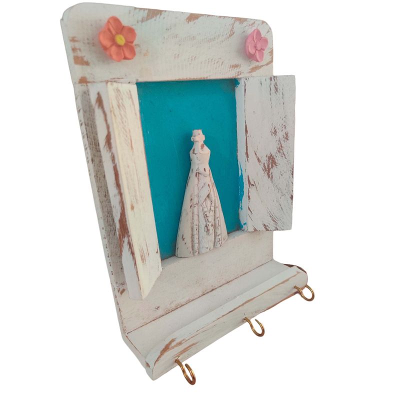 Feito com madeira maciça, este porta-chaves é durável e resistente, garantindo que você desfrute de sua beleza por muitos anos. Com um design que lembra uma janela, o porta-chaves oferece uma sensação tridimensional única. A escultura de Nossa Senhora é o ponto focal, proporcionando um toque espiritual e sagrado à sua casa. Abaixo da janela, encontram-se três ganchinhos estrategicamente colocados, proporcionando um local conveniente e organizado para pendurar suas chaves.