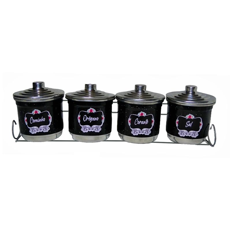 Porta Condimentos Tempero Organizador 4 Potes Alumínio Preto É um conjunto de potes organizadores para temperos, que auxilia no preparo das refeições, além de dar um charme especial para a cozinha. Posicionar o porta temperos longe da luz do sol, do calor do fogão e de locais com excesso de umidade é imprescindível para a conservação dos condimentos. Reserve um espaço fresco e arejado para manter o objeto e garantir a durabilidade dos temperos. Especificações Técnicas: Medidas totais : Largura: 33x10x7cm. Medidas dos potes: Largura: 8cm.Altura: 9,5cm.Peso: 0,236g. Itens Inclusos:01 Porta Condimentos Tempero Organizador 4 Potes Alumínio Preto. Código: PCPRETO-AV.ProdutoLojaPlast.