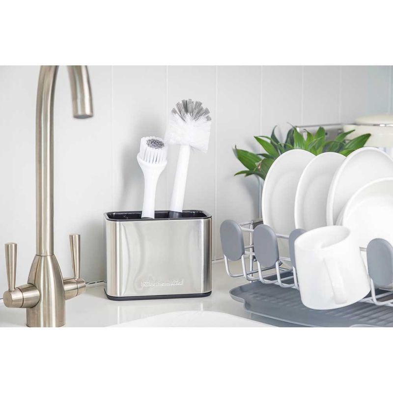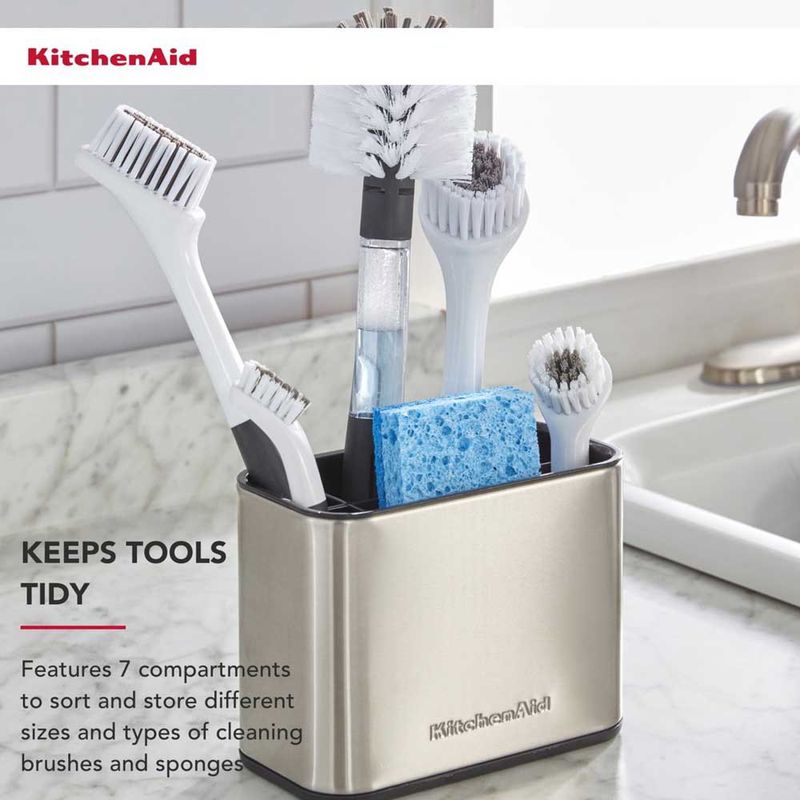 Mantenha suas escovas e ferramentas de lavagem bem organizadas com o porta-escovas para pia de aço inoxidável KitchenAid.Possui sete compartimentos perfurados para acomodar uma variedade de escovas e esponjas de pia, enquanto ferramentas de cabo longo permanecem na posição vertical para acesso conveniente e secagem ao ar.Possui bandeja coletora removível e divisória para limpeza completa.Este suporte para pia é decorado com detalhes em aço inoxidável para combinar perfeitamente com outros acessórios de pia, suportes para pratos e utensílios de cozinha KitchenAid.É apenas lavado à mão e inclui uma garantia vitalícia limitada. - Destaques. • Perfeito para manter as ferramentas de lavagem bem organizadas e de fácil acesso.• Possui 7 compartimentos separados.• O design perfurado garante um fluxo de ar ideal.• Ferramentas de cabo longo são armazenadas na vertical para acesso conveniente.• Os detalhes em aço inoxidável complementam outros acessórios de pia KitchenAid.• Só lavar as mãos.• Inclui garantia limitada vitalícia e substituição sem complicações por um ano. - Especificações: • Material: Aço inox• Cor: Inox