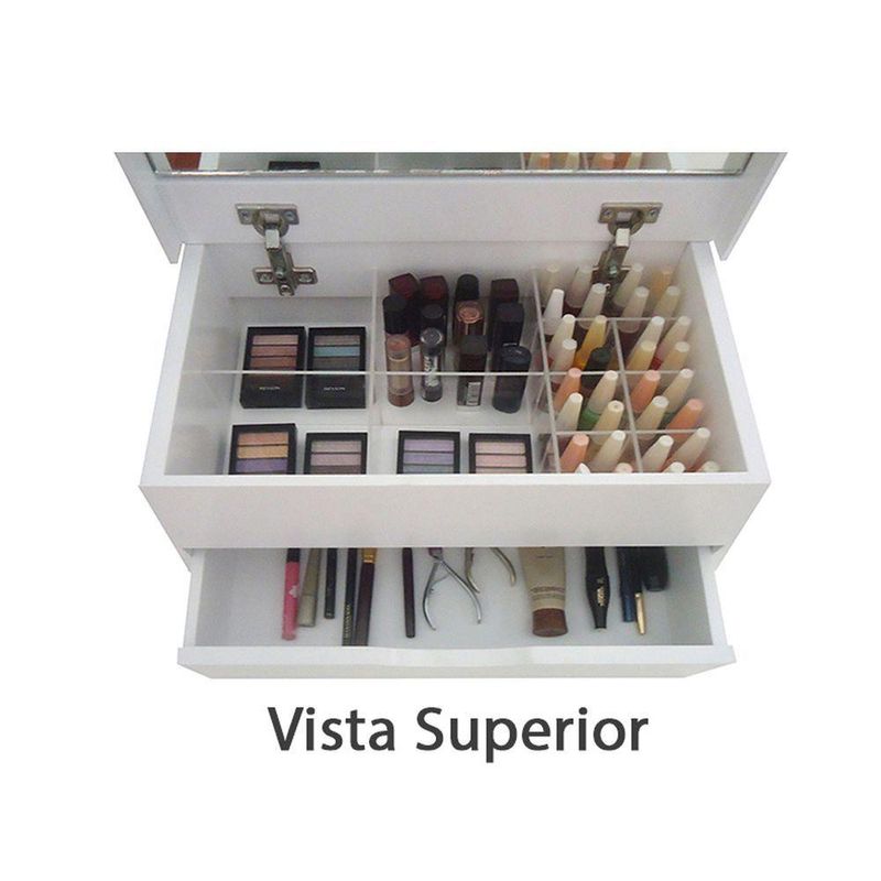 Porta Maquiagem Caixa Organizadora Com Espelho Branco LacaPerfeita para Organizar suas Maquiagens, Esmaltes, Jóias e Acessórios. Prática, Moderna e BonitaDobradiças Especiais, permite que a Tampa permaneça aberta.Acabamento em Laca, Detalhe que lhe confere um Visual ainda mais Charmoso!Material: MDF LaqueadoCor: BrancoAcabamento: LaqueadoDetalhes: Parte superior com divisões em acrílico cristalGaveta: 01 gavetaTampa: Tampa com espelho na parte interna. Dobradiças especiais, permite que a tampa permaneça abertaAltura: 24 cm Largura: 40 cm Profundidade: 26 cm Disponível também nas cores: Branco, Preto, Amarelo, Vermelho e Azul(Consulte nossos outros anúncios)Somos FabricantesInstalação: O produto será entregue montado.Garantia: 03 meses contra defeitos de fabricação Conteúdo da embalagem: 01 CaixaAtenção: Item composto apenas pela Caixa, itens decorativos NÃO acompanham o produto. Cuidados: utilizar pano macio e levemente umedecido. Nunca use solventes ou abrasivos.