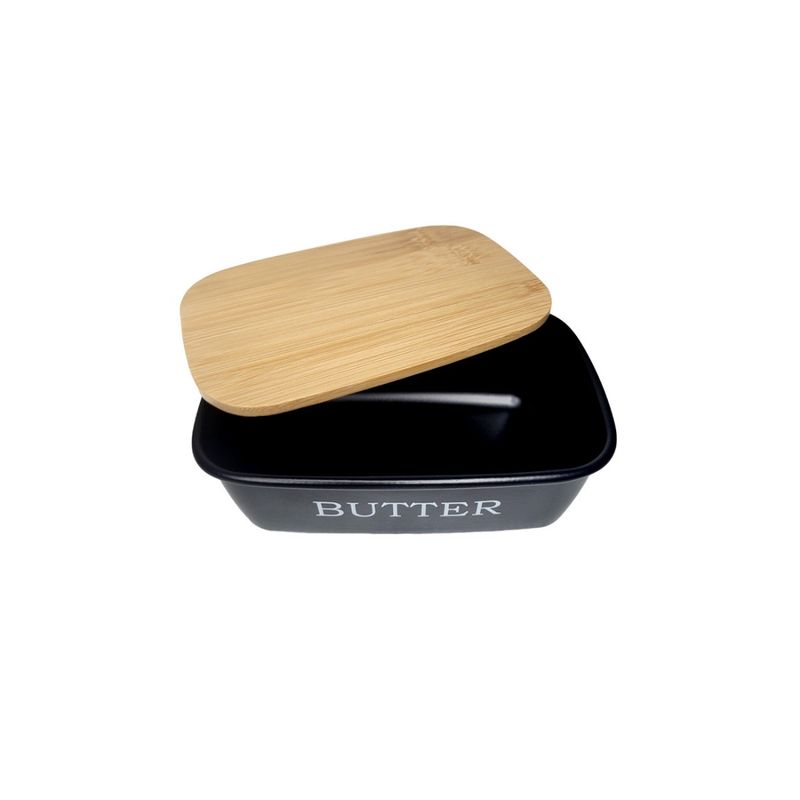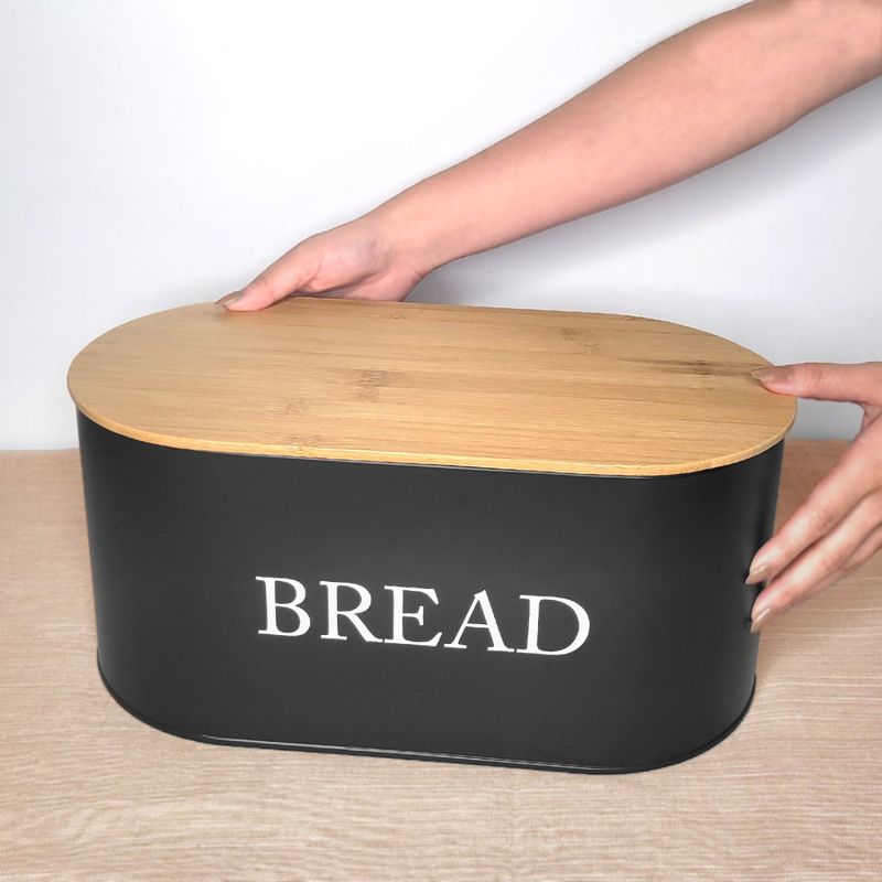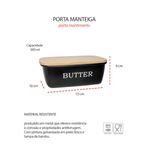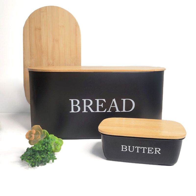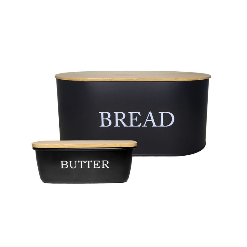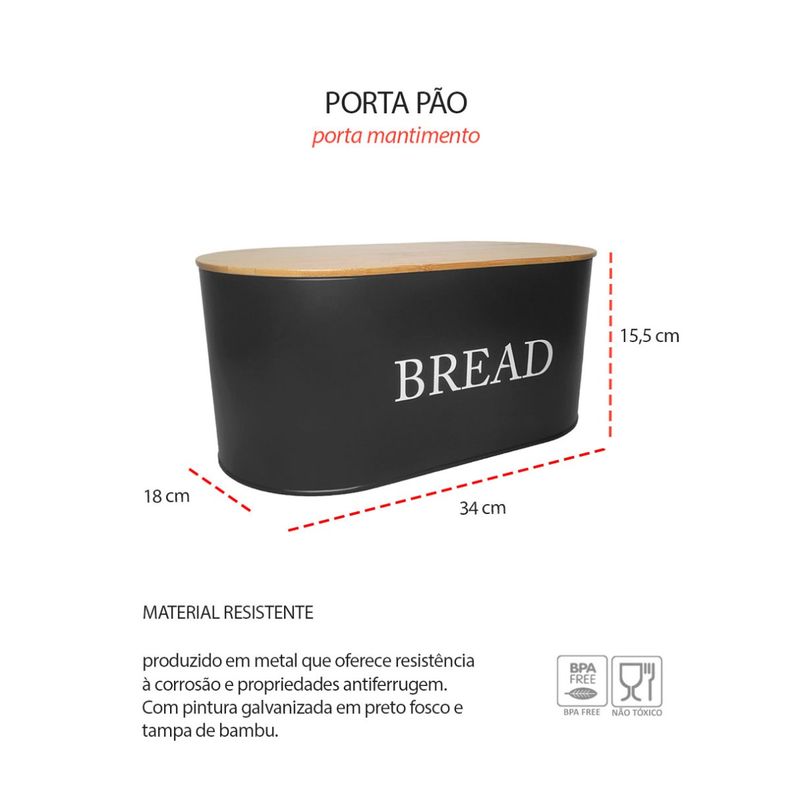 Porta pao preto e manteigueira com tampa de bambu. Pote produzido em aço carbono e tampa de bambu. O porta mantimentos possui pintura galvanizada interna e externa na mesma cor. O porta pao possui acabamento resistente a corrosao e propriedades antiferrugem. Contem: 1 Porta Pao Medidas: 34 x 18 x 15,5 cm 1 Porta Manteiga Volume: 500 ml Medidas: 15 x 10 x 6 cm Material: aço carbono e bambu Peso: 1350g